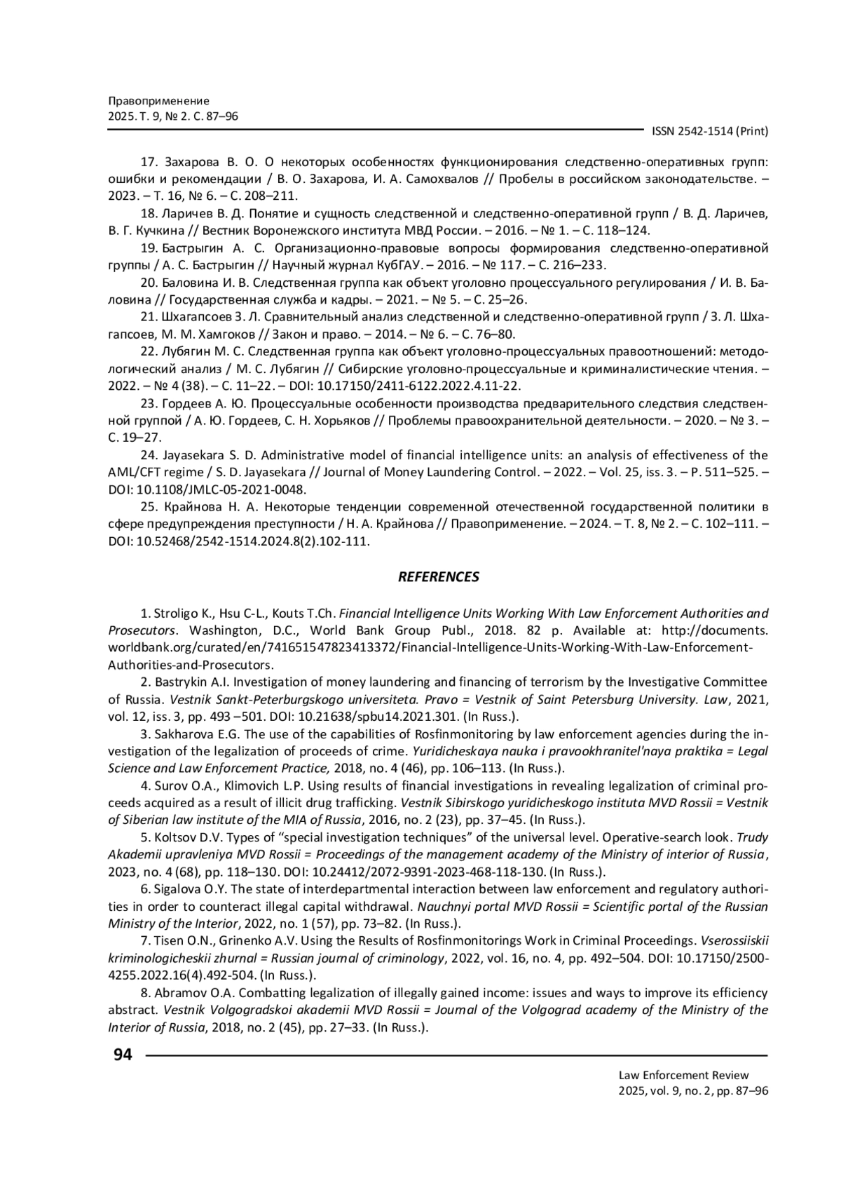 2. 	Бастрыкин А. И. Расследование легализации доходов, полученных преступным путем, и финансирования терроризма: практика следственного комитета России / А. И. Бастрыкин // Вестник Санкт-Петербургского университета. Право. - 2021. - Т. 12, вып. 3. - С. 493-501. -. DOI: 10.21638/spbu14.2021.301 EDN: NMBZYP