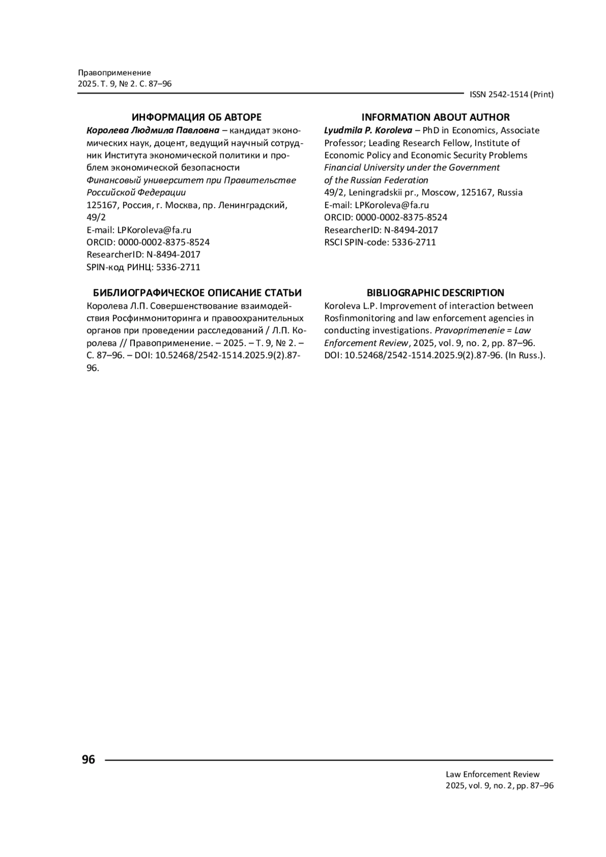 11. 	Кузовлева Н. Ф. Совершенствование механизма взаимодействия Росфинмониторинга с правоохранительными органами и контролирующими организациями / Н. Ф. Кузовлева, М. И. Митюкова, А. А. Костина // Представительная власть - XXI век: законодательство, комментарии, проблемы. - 2020. - № 5-6 (180-181). - С. 26-31. EDN: DNSXRO