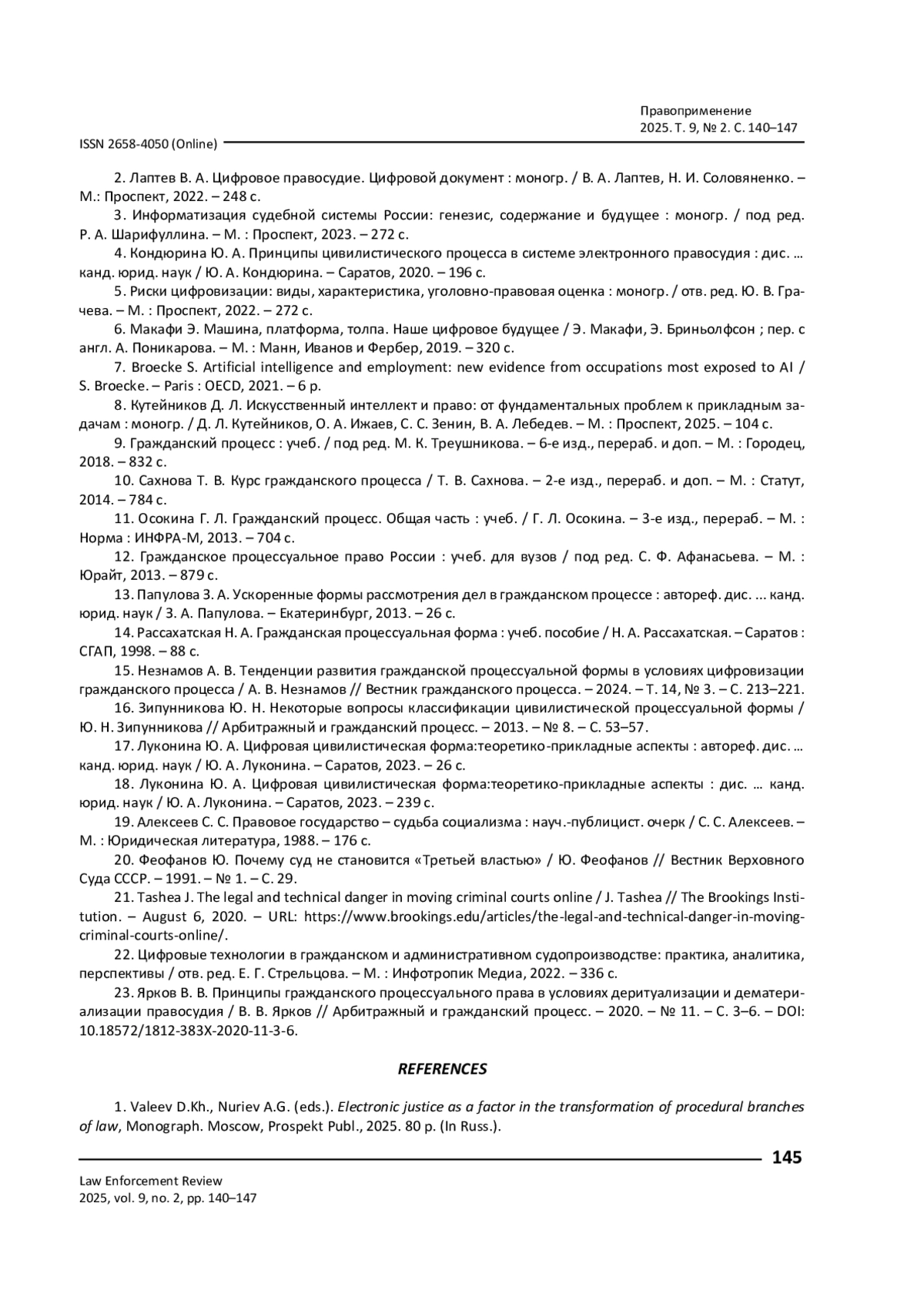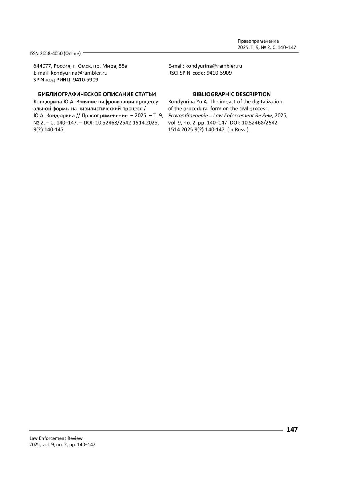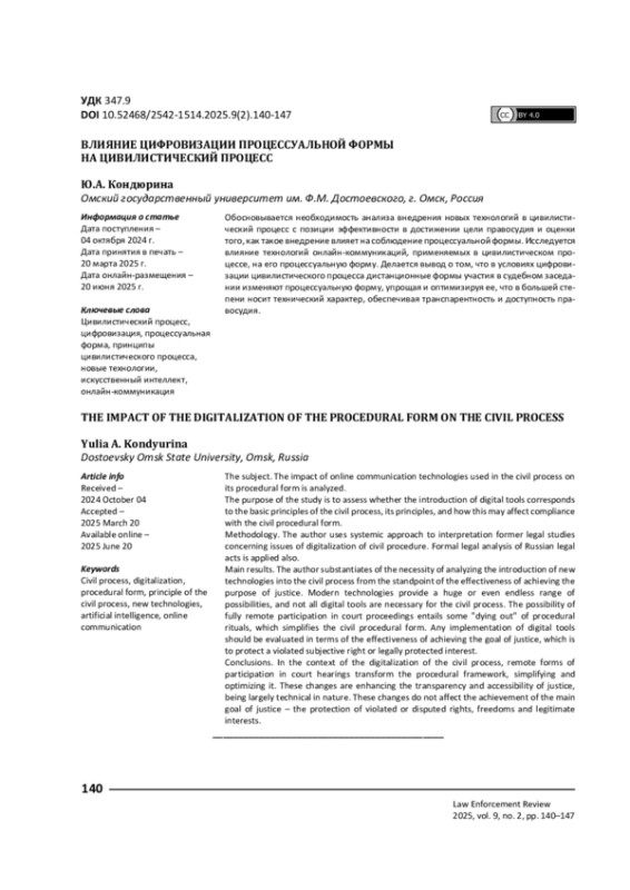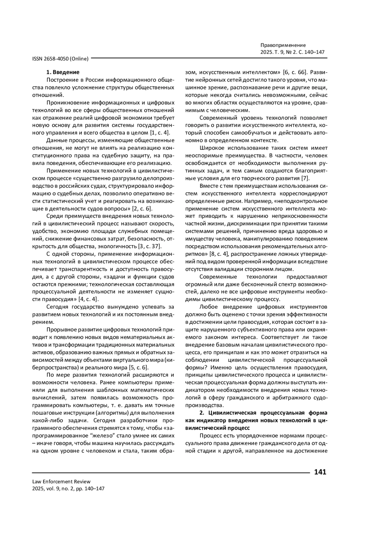 АЛЕКСЕЕВНА К. Ю. ВЛИЯНИЕ ЦИФРОВИЗАЦИИ ПРОЦЕССУАЛЬНОЙ ФОРМЫ НА ЦИВИЛИСТИЧЕСКИЙ ПРОЦЕСС // ПРАВОПРИМЕНЕНИЕ. 2025. ТОМ 9, № 2