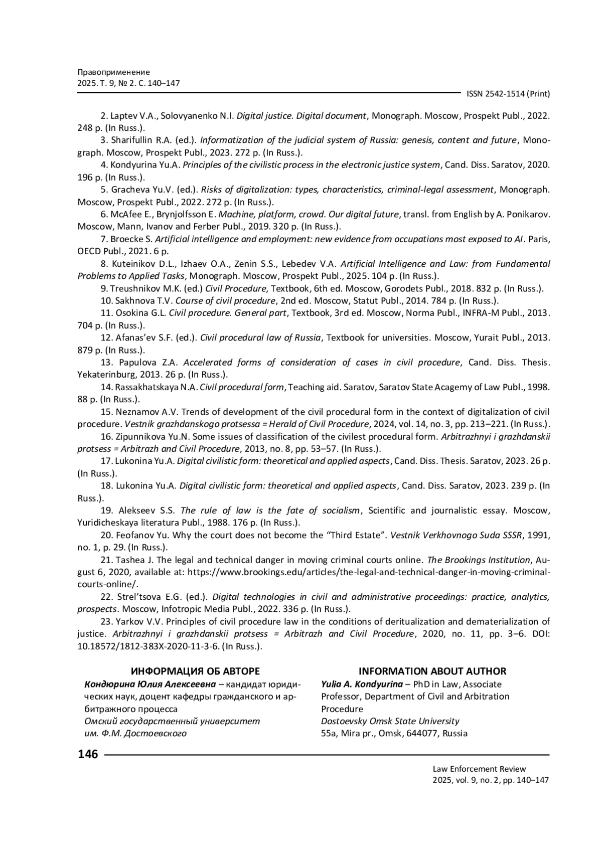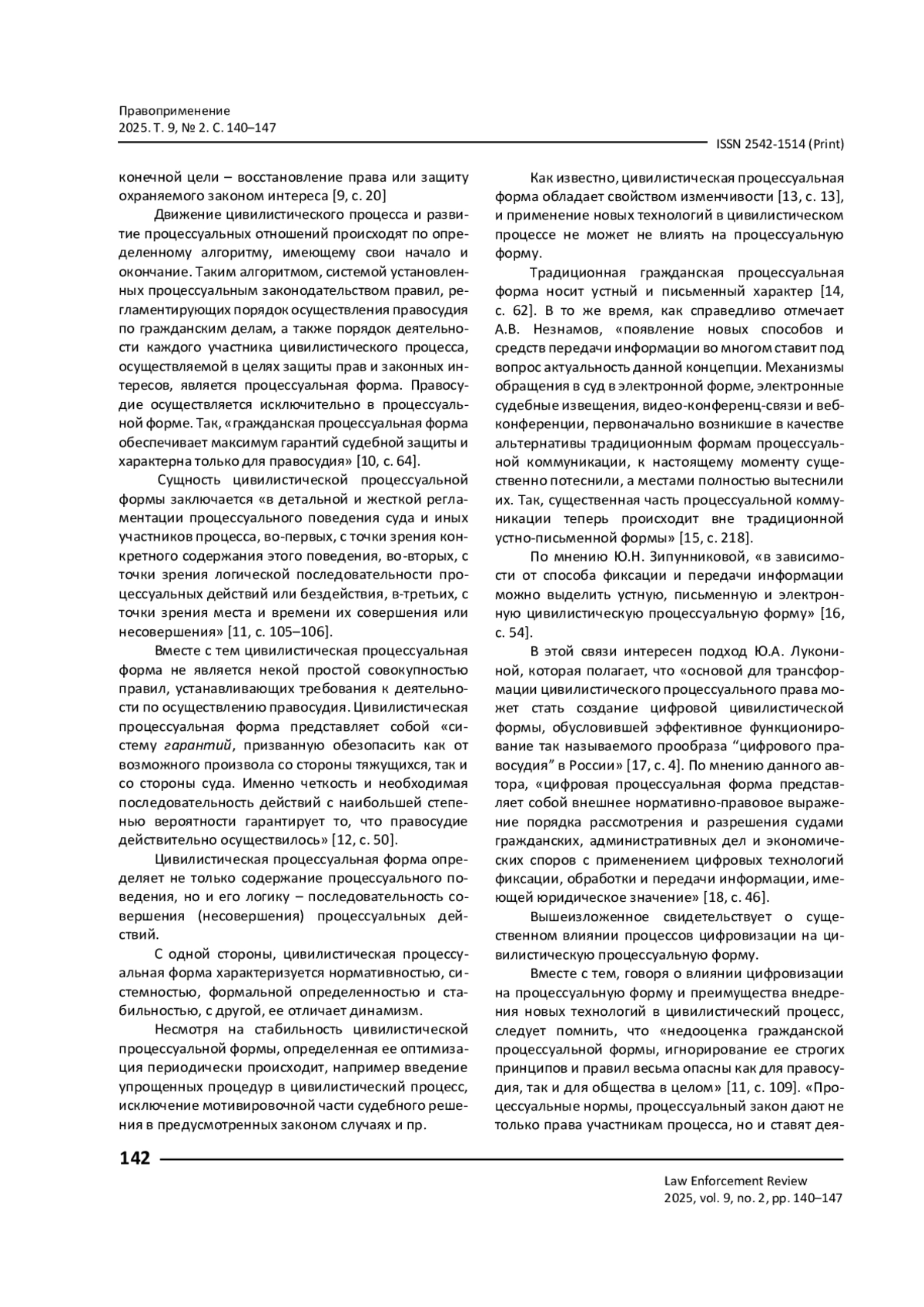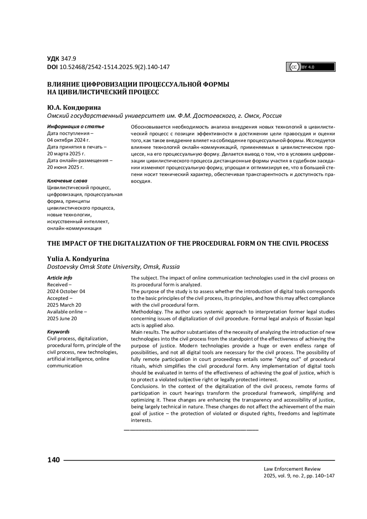 АЛЕКСЕЕВНА К. Ю. ВЛИЯНИЕ ЦИФРОВИЗАЦИИ ПРОЦЕССУАЛЬНОЙ ФОРМЫ НА ЦИВИЛИСТИЧЕСКИЙ ПРОЦЕСС // ПРАВОПРИМЕНЕНИЕ. 2025. ТОМ 9, № 2