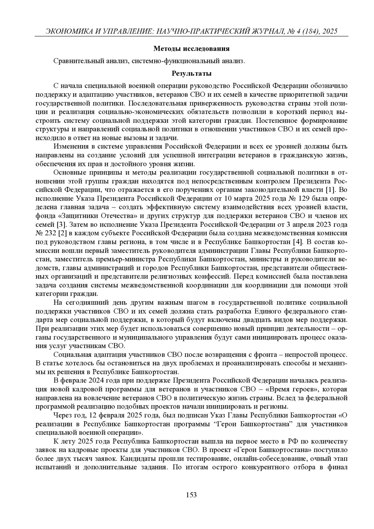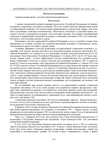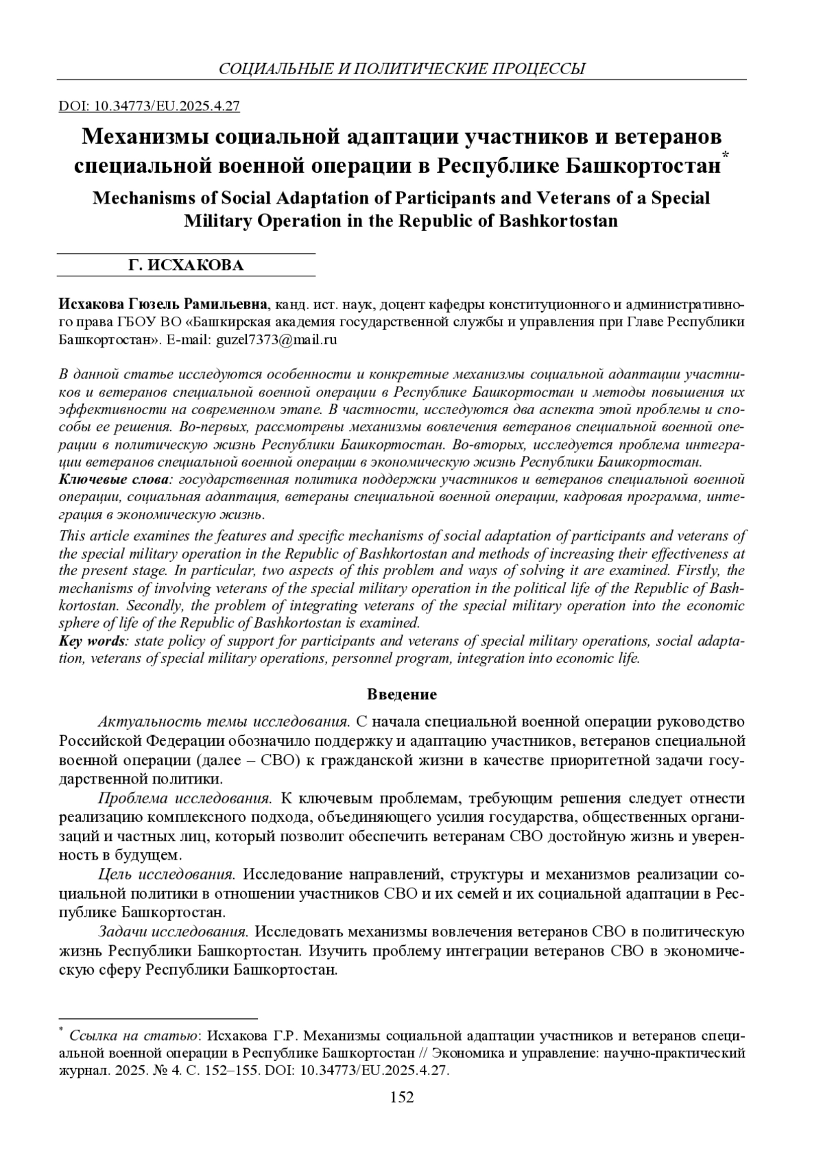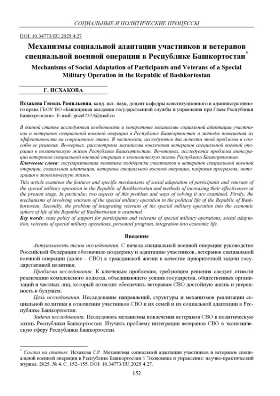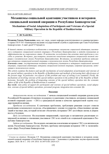В данной статье исследуются особенности и конкретные механизмы социальной адаптации участников и ветеранов специальной военной операции в Республике Башкортостан и методы повышения их эффективности на современном этапе. В частности, исследуются два аспекта этой проблемы и способы ее решения. Во-первых, рассмотрены механизмы вовлечения ветеранов специальной военной операции в политическую жизнь Республики Башкортостан. Во-вторых, исследуется проблема интеграции ветеранов специальной военной операции в экономическую жизнь Республики Башкортостан.