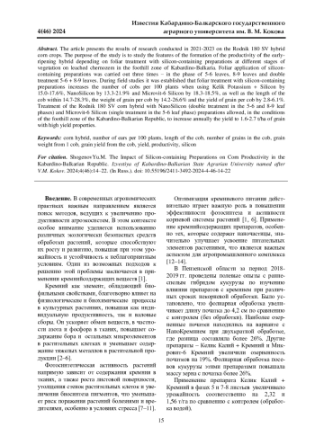 16. Семина С. А., Гаврюшина И. В., Никулина Е. В. Влияние препаратов с кремнием на формирование урожайности кукурузы // Нива Поволжья. 2020. № 1(54). С.9-14. DOI: 10.36461/NP.2020.54.1.002 EDN: KKQPTM