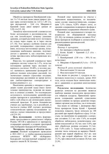 В статье приведены результаты исследований, проведенных в 2021-2023 гг. на посевах гибрида кукурузы Родник 180 СВ. Цель исследования - изучить особенности формирования продуктивности раннеспелого гибрида в зависимости от внекорневой обработки препаратами, содержащих кремний, в разные сроки вегетации на черноземе выщелоченном в предгорной зоне КабардиноБалкарии. Некорневое внесение кремнийсодержащих препаратов проводилось три раза - в фазу 5-6 листьев, 8-9 листьев и двойная обработка 5-6 + 8-9 листьев. В ходе полевых исследований установлено, что при листовой обработке препаратами с кремнием увеличивается число початков на 100 растений при применении Келик Калий+Кремний на 15,0-17,6%, НаноКремний на 13,3-21,9% и Микровит-6 Кремний на 18,3-18,5%, а также длина початка в пределах 14,7-28,3%, масса зерна с початка 14,2-26,6% и выход зерна с початка на 2,8-6,1%. Обработка гибрида кукурузы Родник 180 СВ препаратами НаноКремний (двукратная обработка в фазы 5-6 и 8-9 листьев) и Микровит-6 Кремний (однократная в фазу 5-6 листьев) позволила в условиях предгорной зоны Кабардино-Балкарской Республики ежегодно получать увеличение урожайности до 1,6-2,7 т/га зерна с высокими урожайными свойствами.