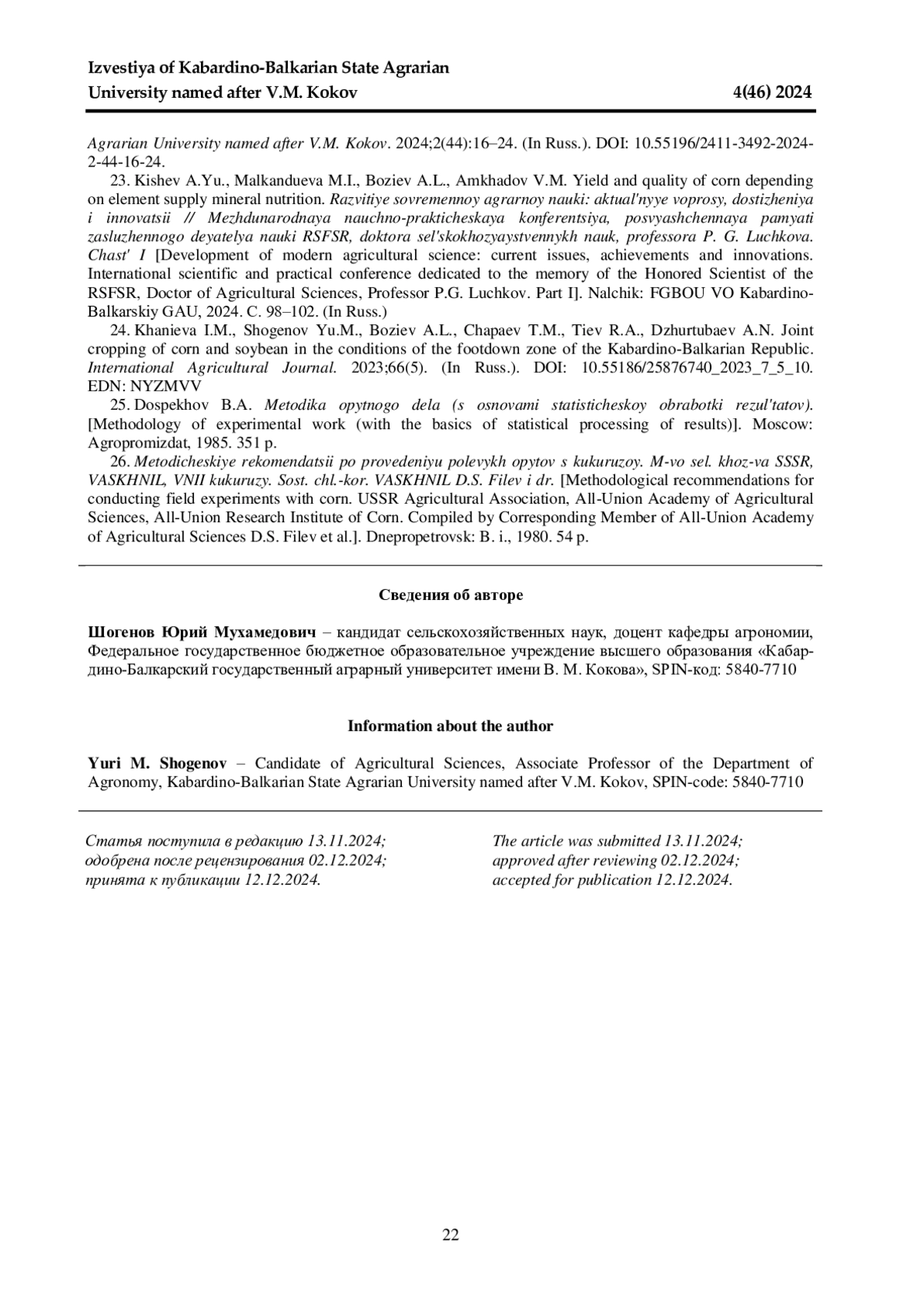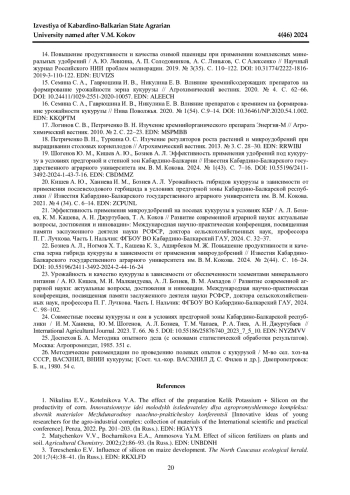 19. Шогенов Ю. М., Кишев А. Ю., Бозиев А. Л. Эффективность применения удобрений под кукурузу в условиях предгорной и степной зон Кабардино-Балкарии // Известия Кабардино-Балкарского государственного аграрного университета им. В. М. Кокова. 2024. № 1(43). С. 7-16. 10.55196/2411- 3492-2024-1-43-7-16. DOI: 10.55196/2411-3492-2024-1-43-7-16 EDN: CBDMMZ