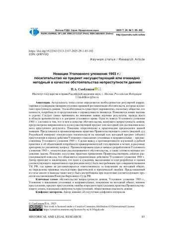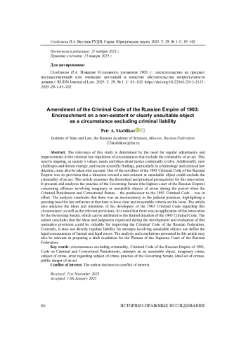 Актуальность темы статьи определяется необходимостью регулярной корректировки и усовершенствования уголовно-правовой регламентации обстоятельств, которые исключают преступность деяния. Эта необходимость существует перманентно, поскольку общество, его ценности, потребности и представления о справедливости меняются. Появляются новые вызовы и угрозы. Следует также принимать во внимание новые научные результаты, прежде всего в области криминологии и в доктрине уголовного права. Одна из новелл Уголовного уложения 1903 г. состояла в том, что в нем в качестве обстоятельства, влекущего непреступность деяния, предусмотрена направленность на несуществующий предмет или негодный для достижения искомого преступного результата. Показаны теоретические и практические предпосылки данной новации. Представлена и проанализирована практика Правительствующего сената (высший суд Российской империи) относительно посягательств на мнимый или негодный предмет (объект) преступления в период действия Уложения о наказаниях уголовных и исправительных - предшественника Уголовного уложения 1903 г. Сделан вывод о противоречивости изученной судебной практики и об объективной потребности правоприменителей того времени в четких и разумных критериях по указанному вопросу. Проанализированы идеи и замысел разработчиков Уголовного уложения 1903 г. относительно рассматриваемого обстоятельства, а также соответствующее положение закона. Показано отсутствие практики применения Правительствующим сенатом рассматриваемой новеллы, что объясняется ограниченным действием Уголовного уложения 1903 г. Автор приходит к заключению, что идеи и суждения, высказанные в ходе разработки и оценки соответствующего нормативного предписания могут быть востребованы при совершенствовании УК РФ, где прямо не регламентируется ответственность за покушение на негодный объект, не определены правовые последствиях фактической и юридической ошибки. Представленный в статье анализ и выводы также могут быть востребованы при подготовке соответствующих проектов постановления Пленума Верховного Суда РФ.