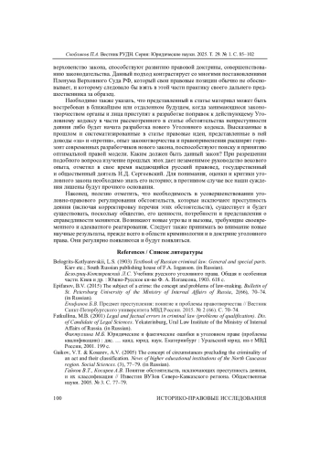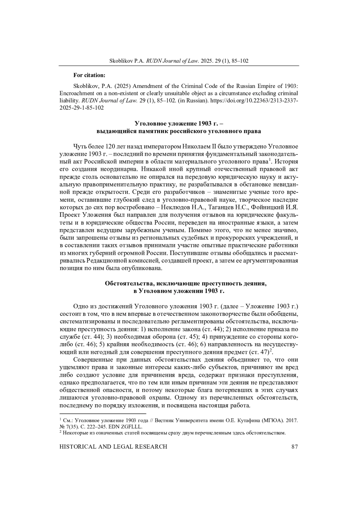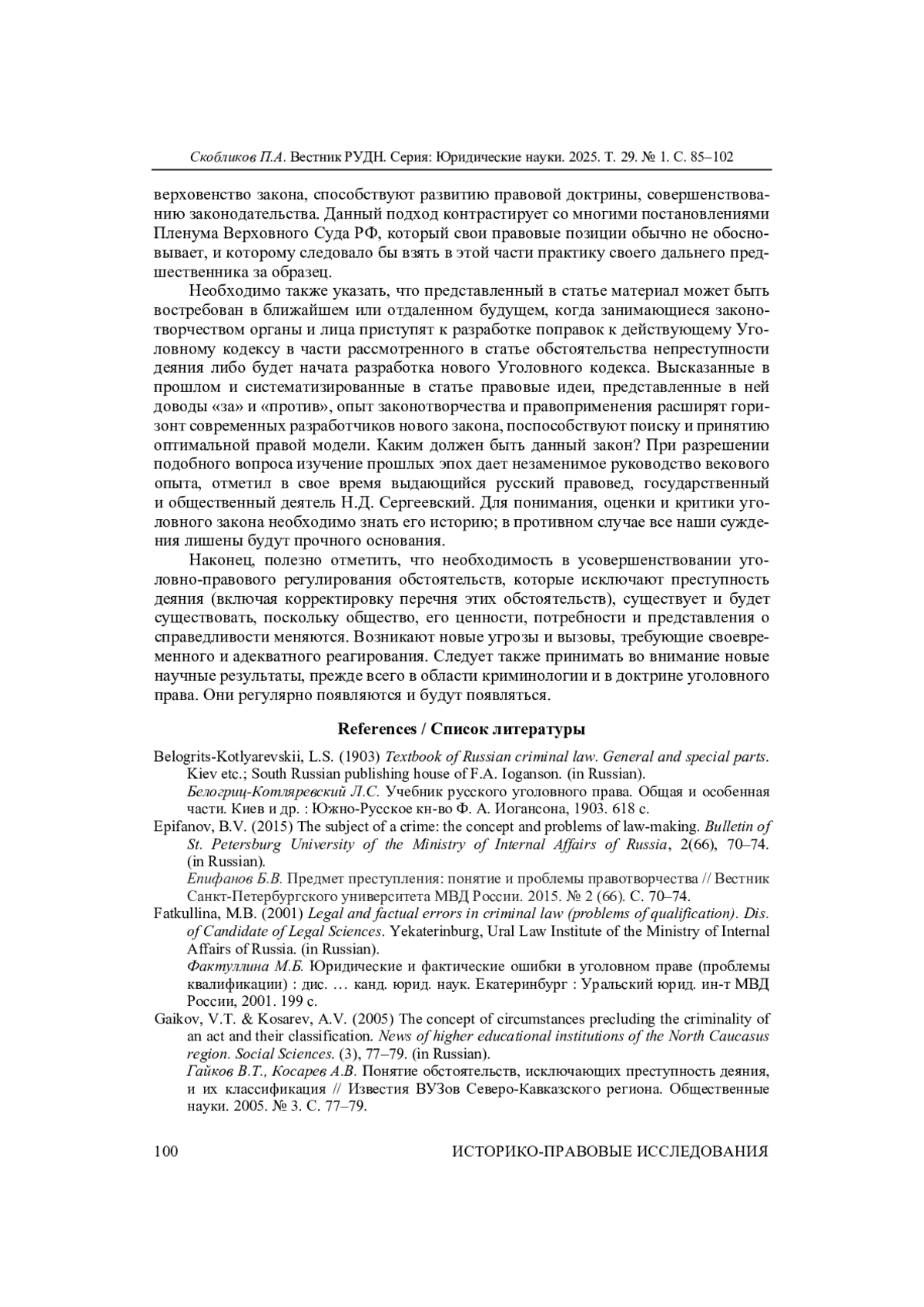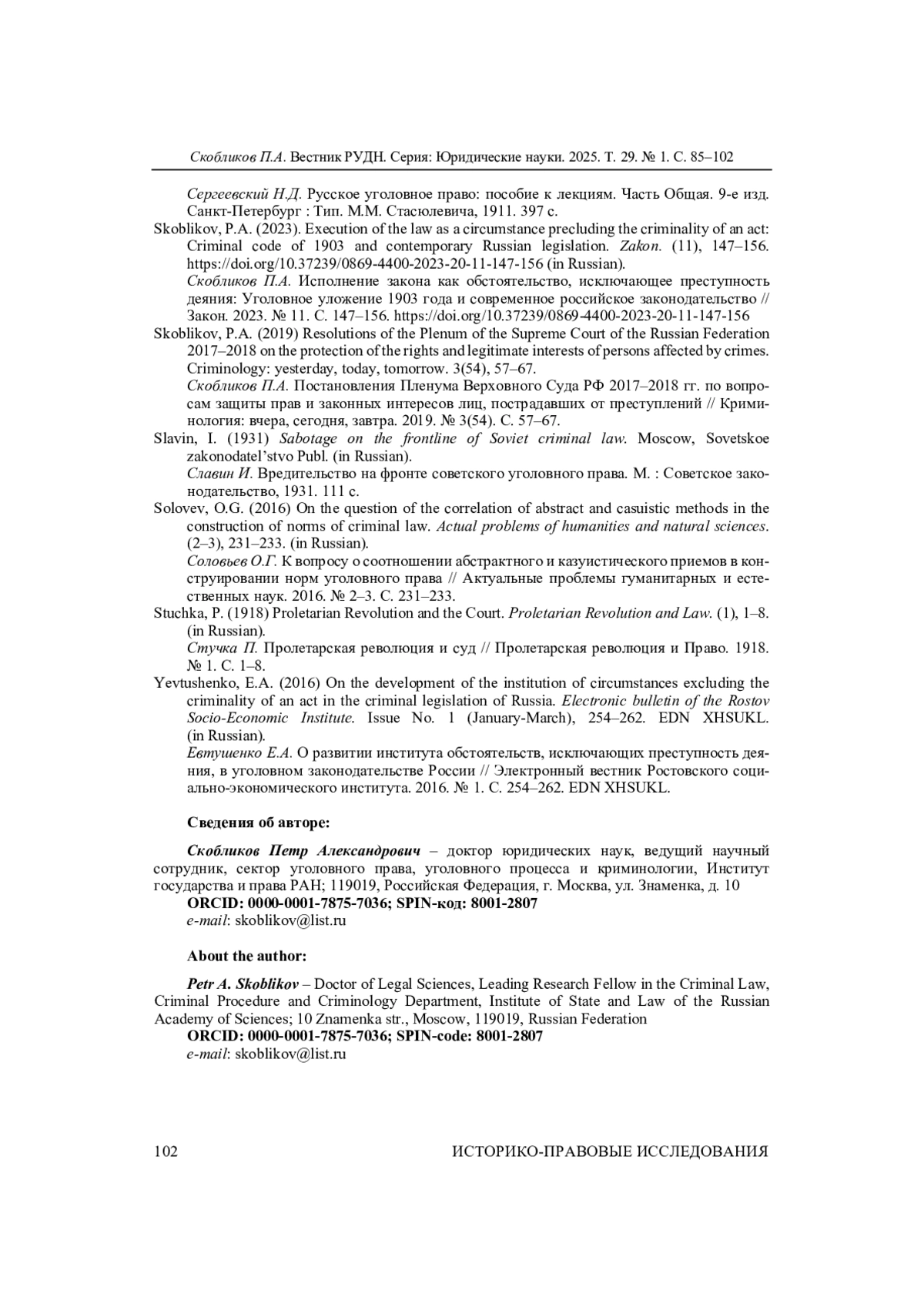 19. 	Скобликов П.А. Исполнение закона как обстоятельство, исключающее преступность деяния: Уголовное уложение 1903 года и современное российское законодательство // Закон. 2023. № 11. С. 147-156. DOI: 10.37239/0869-4400-2023-20-11-147-156 EDN: WMWMPP