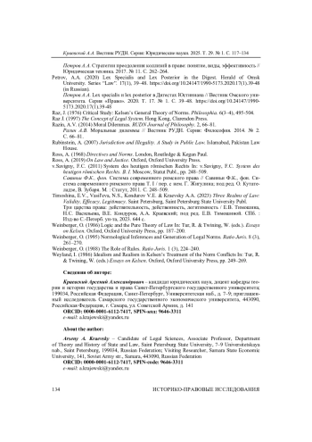 27. 	Kraevsky, A.A. (2015) Hans Kelsen’s Pure Theory of Law and Modern Legal Positivism. Proceedings of Higher Educational Institutions. Pravovedenie. 2, pp. 88-125.