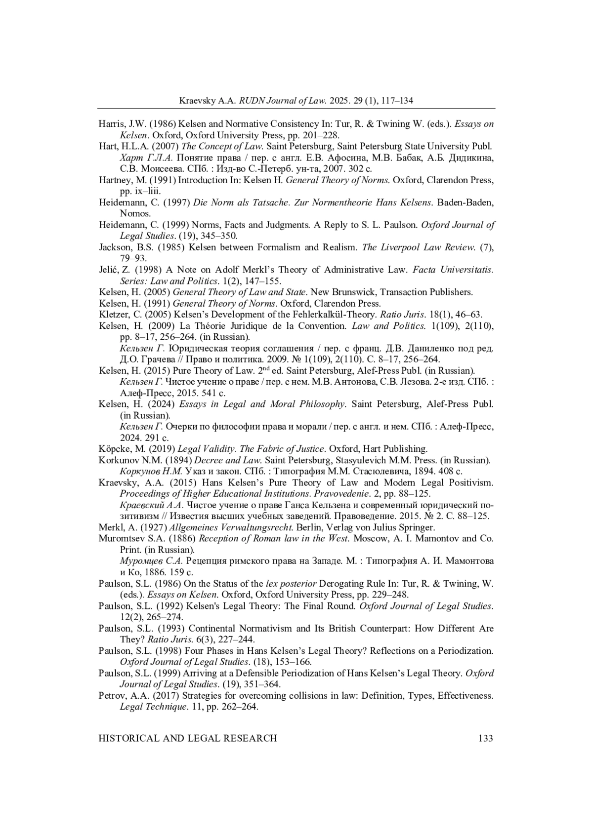 32. 	Paulson, S.L. (1992) Kelsen’s Legal Theory: The Final Round. Oxford Journal of Legal Studies. 12(2), 265-274. EDN: IVMBFR