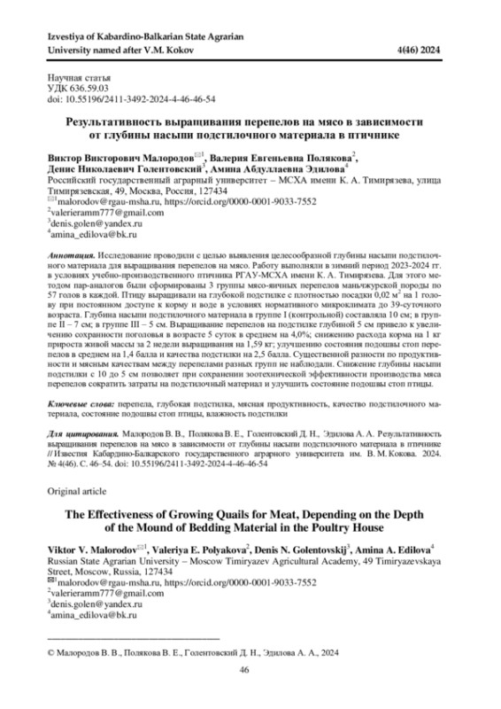 МАЛОРОДОВ В. В., ПОЛЯКОВА В. Е., ГОЛЕНТОВСКИЙ Д. Н., ЭДИЛОВА А. А. РЕЗУЛЬТАТИВНОСТЬ ВЫРАЩИВАНИЯ ПЕРЕПЕЛОВ НА МЯСО В ЗАВИСИМОСТИ ОТ ГЛУБИНЫ НАСЫПИ ПОДСТИЛОЧНОГО МАТЕРИАЛА В ПТИЧНИКЕ // ИЗВЕСТИЯ КАБАРДИНО-БАЛКАРСКОГО ГОСУДАРСТВЕННОГО АГРАРНОГО УНИВЕРСИТЕТА ИМ. В. М. КОКОВА. 2024. № 4 (46)
