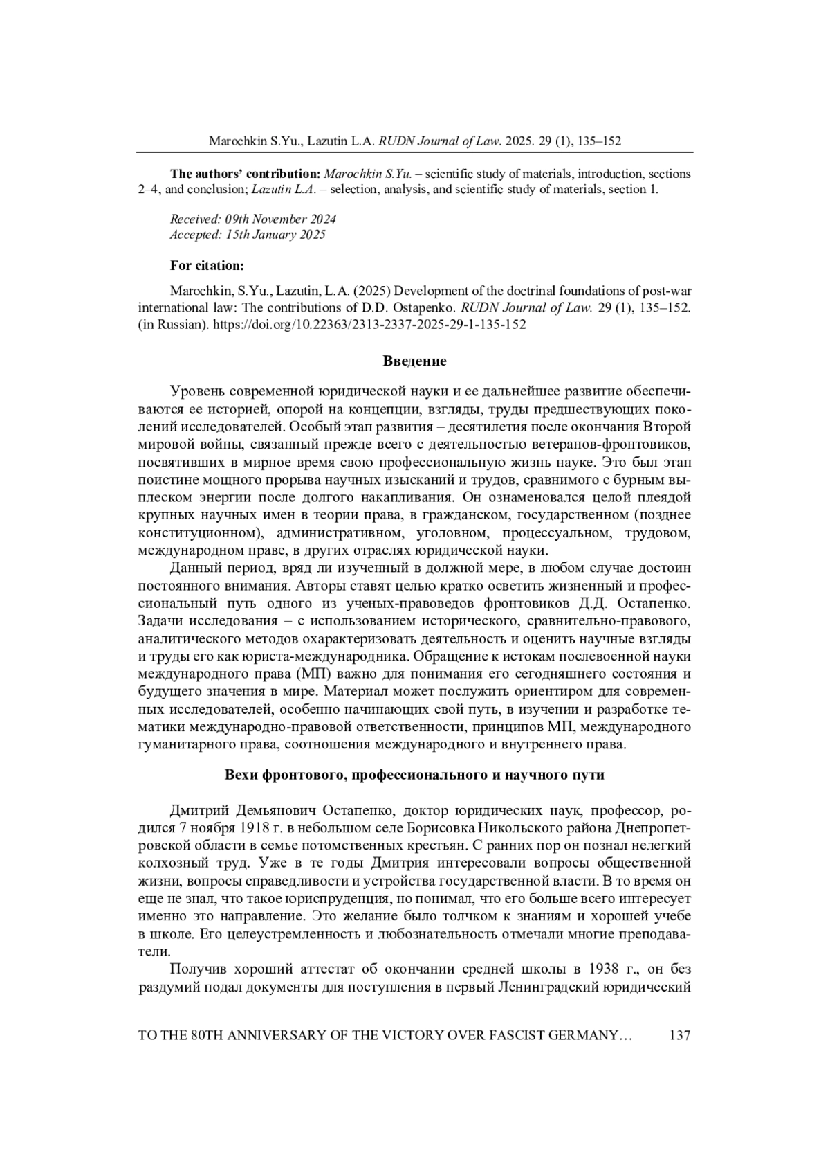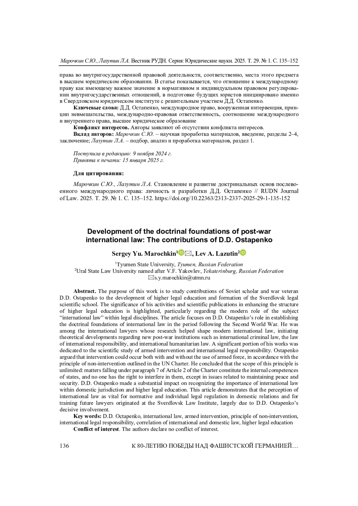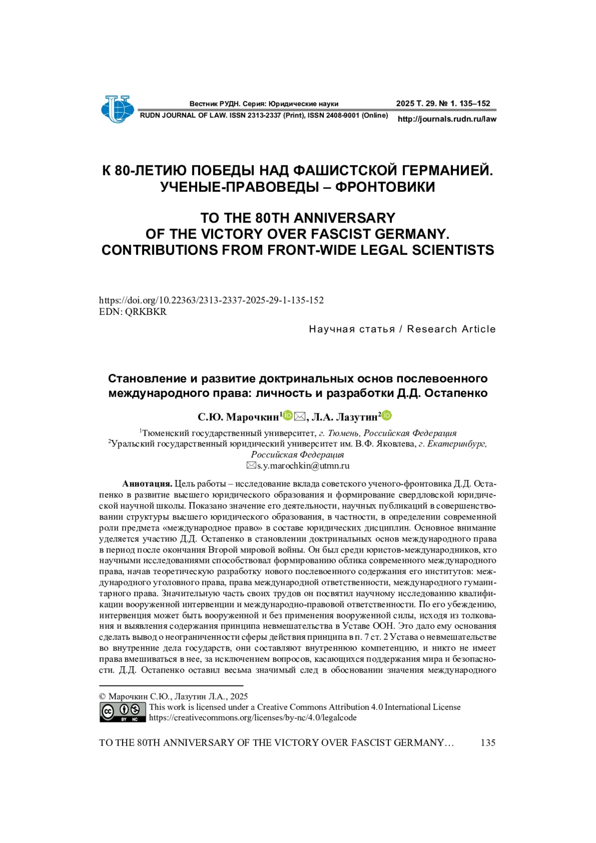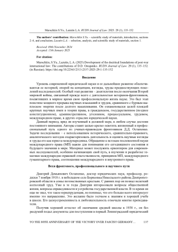 Цель работы - исследование вклада советского ученого-фронтовика Д. Д. Остапенко в развитие высшего юридического образования и формирование свердловской юридической научной школы. Показано значение его деятельности, научных публикаций в совершенствовании структуры высшего юридического образования, в частности, в определении современной роли предмета «международное право» в составе юридических дисциплин. Основное внимание уделяется участию Д. Д. Остапенко в становлении доктринальных основ международного права в период после окончания Второй мировой войны. Он был среди юристов-международников, кто научными исследованиями способствовал формированию облика современного международного права, начав теоретическую разработку нового послевоенного содержания его институтов: международного уголовного права, права международной ответственности, международного гуманитарного права. Значительную часть своих трудов он посвятил научному исследованию квалификации вооруженной интервенции и международно-правовой ответственности. По его убеждению, интервенция может быть вооруженной и без применения вооруженной силы, исходя из толкования и выявления содержания принципа невмешательства в Уставе ООН. Это дало ему основания сделать вывод о неограниченности сферы действия принципа в п. 7 ст. 2 Устава о невмешательстве во внутренние дела государств, они составляют внутреннюю компетенцию, и никто не имеет права вмешиваться в нее, за исключением вопросов, касающихся поддержания мира и безопасности. Д. Д. Остапенко оставил весьма значимый след в обосновании значения международного права во внутригосударственной правовой деятельности, соответственно, места этого предмета в высшем юридическом образовании. В статье показывается, что отношение к международному праву как имеющему важное значение в нормативном и индивидуальном правовом регулировании внутригосударственных отношений, в подготовке будущих юристов инициировано именно в Свердловском юридическом институте с решительным участием Д. Д. Остапенко.