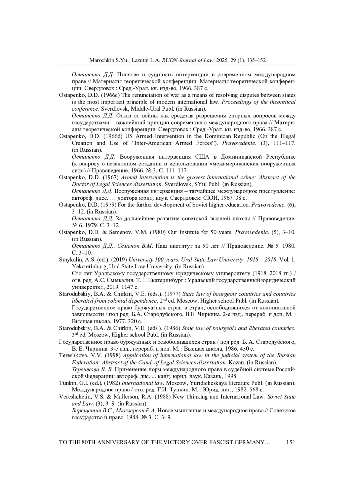 25. 	Остапенко Д.Д. Понятие и сущность интервенции в современном международном праве // Материалы теоретической конференции. Материалы теоретической конференции. Свердловск: Сред.-Урал. кн. изд-во, 1966. 387 с.
