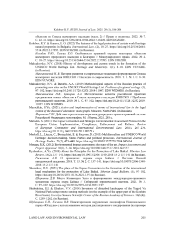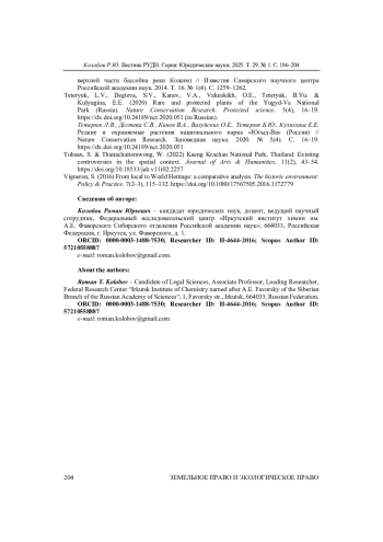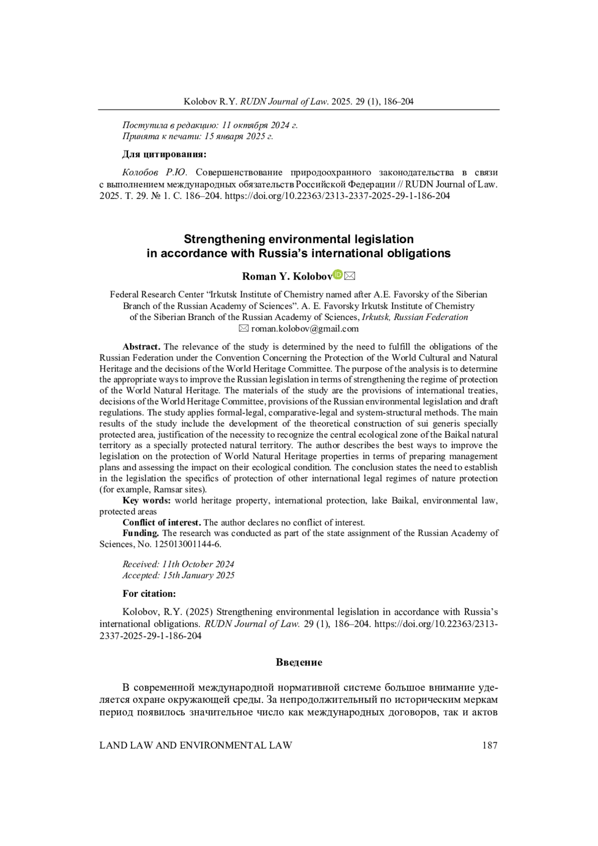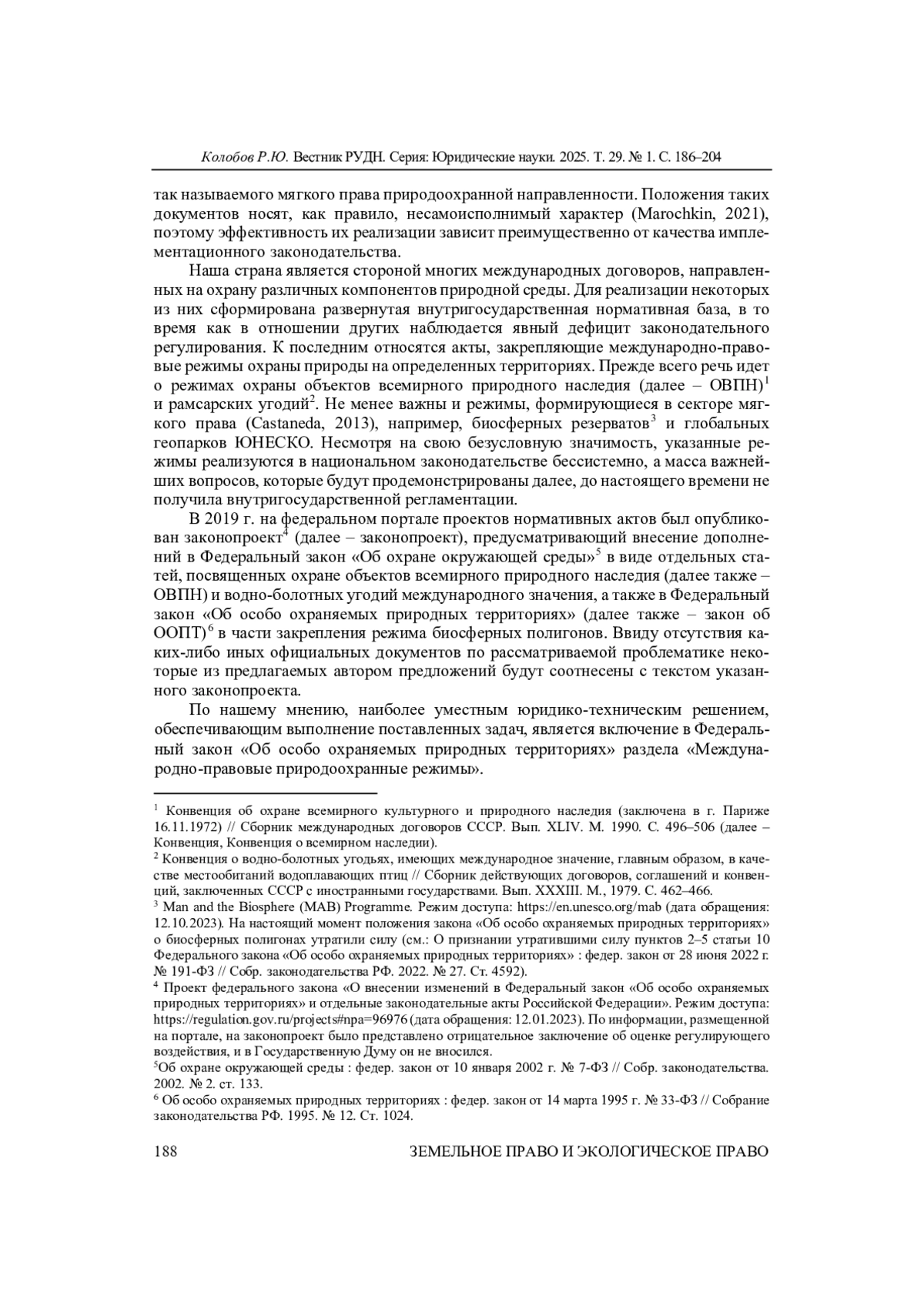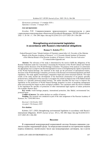 КОЛОБОВ Р. Ю. СОВЕРШЕНСТВОВАНИЕ ПРИРОДООХРАННОГО ЗАКОНОДАТЕЛЬСТВА В СВЯЗИ С ВЫПОЛНЕНИЕМ МЕЖДУНАРОДНЫХ ОБЯЗАТЕЛЬСТВ РОССИЙСКОЙ ФЕДЕРАЦИИ // ВЕСТНИК РОССИЙСКОГО УНИВЕРСИТЕТА ДРУЖБЫ НАРОДОВ. СЕРИЯ: ЮРИДИЧЕСКИЕ НАУКИ. 2025. Т. 29 № 1