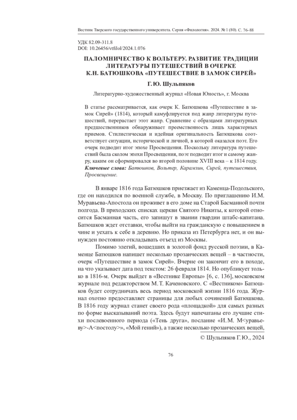 историческим и топографическим описанием всех тех мест. Москва : Университетская типография, 1800. 250 с. - Фридман Н.В. Проза Батюшкова. Москва : Наука, 1965. 165 с.