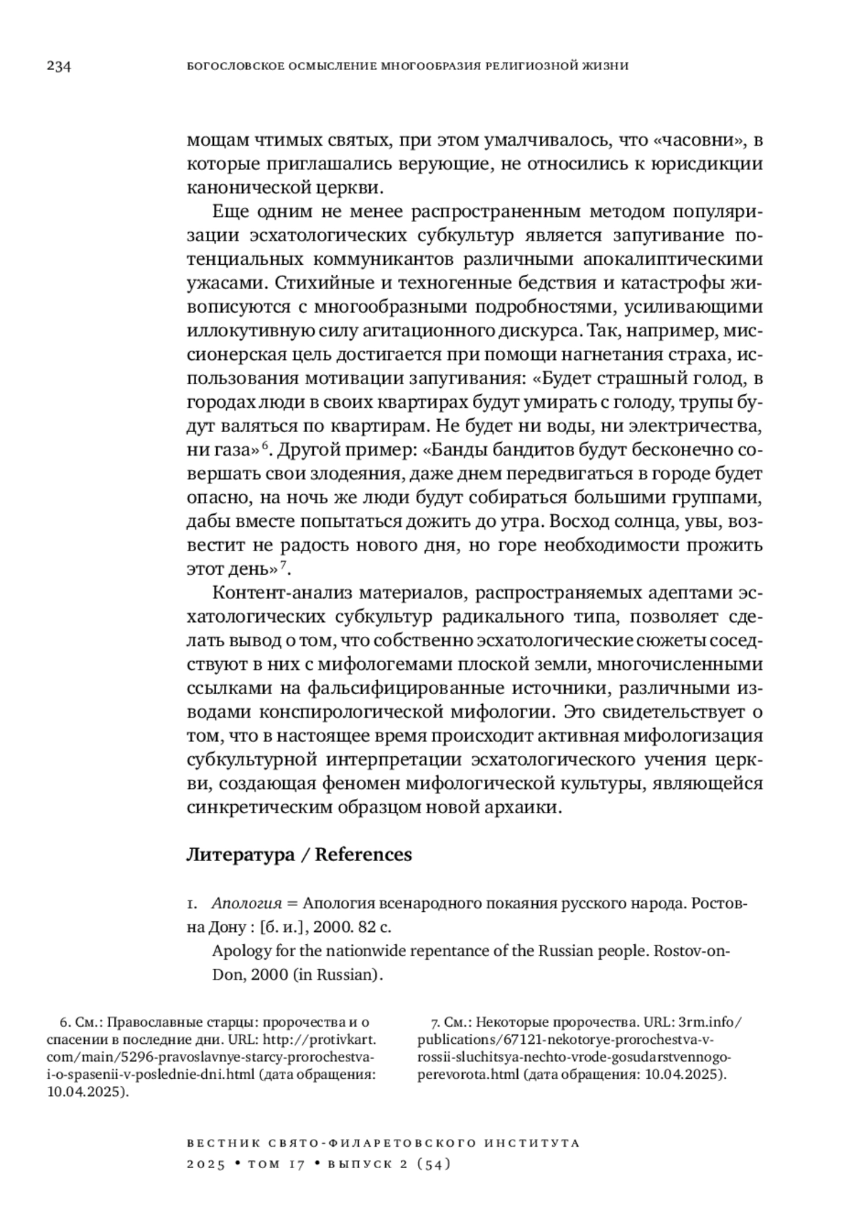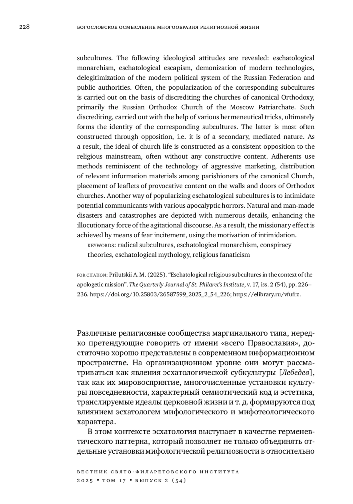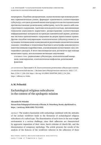 Современное увлечение эсхатологией в сочетании с установками архаического мировосприятия приводит к формированию соответствующего мировоззрения и к появлению эсхатологических религиозных субкультур радикального типа. Их адептам свойственны агрессивное навязывание своих взглядов, резкая критика церковной жизни, распространение конспирологической мифологии. Влияние таких субкультур на околоцерковную среду является серьезным вызовом для Православной церкви. В статье представлены результаты анализа особенностей мировосприятия приверженцев данных субкультур. Выявлены присущие им мировоззренческие установки: эсхатологический монархизм, эсхатологический эскапизм, демонизация современных технологий, делигитимация современного политического устройства Российской Федерации и органов публичной власти. Часто популяризация религиозных субкультур осуществляется путем дискредитации православия и прежде всего Русской православной церкви Московского патриархата. Подобная дискредитация, осуществляемая при помощи различных герменевтических уловок, формирует идентичность соответствующих субкультур, а их идеал духовной жизни конструируется как последовательное противопоставление религиозному мейнстриму, часто без какого-либо конструктивного содержания. Адептами используются методы, напоминающие технологии агрессивного маркетинга: распространение соответствующих информационных материалов на приходах канонической церкви, размещение листовок провокативного содержания на дверях православных храмов. Другим способом популяризации эсхатологических субкультур является запугивание потенциальных коммуникантов различными апокалиптическими ужасами: стихийные и техногенные бедствия и катастрофы живописуются с многочисленными подробностями, усиливающими иллокутивную силу агитационного дискурса. В итоге миссионерская цель достигается при помощи нагнетания страха, использования мотивации запугивания.