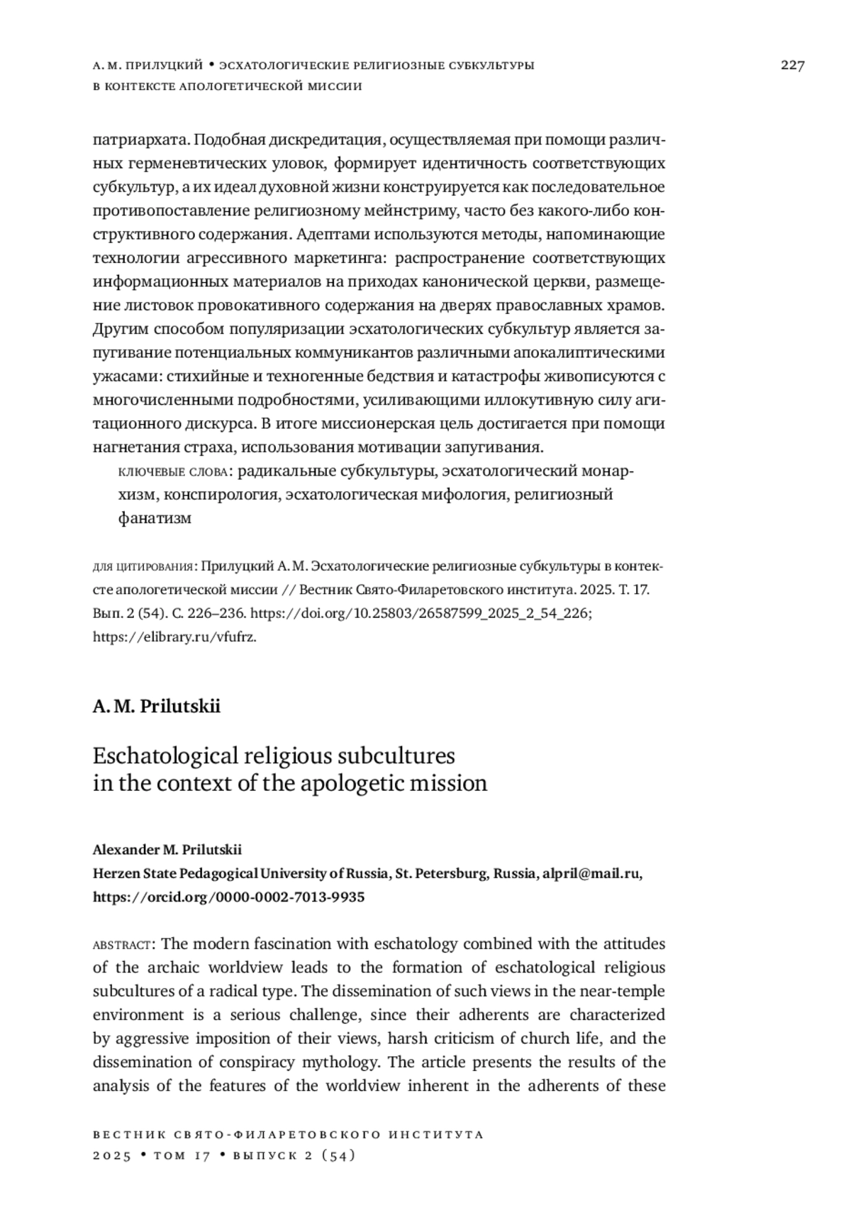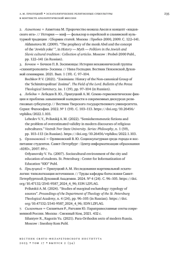 6. 	Прилуцкий А. М. Исследования маргинальной эсхатологии: типологизация источников // Труды кафедры богословия Санкт-Петербургской Духовной Академии. 2024. № 4 (24). С. 96-105. ;. DOI: 10.47132/2541-9587_2024_4_96 EDN: LZFLAG