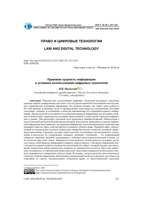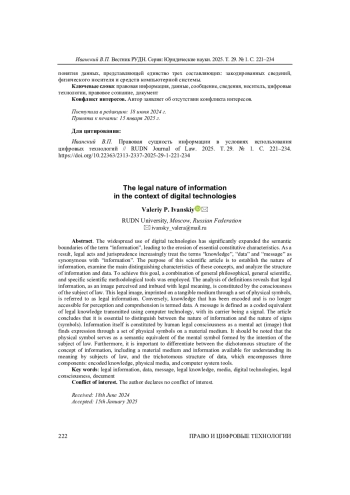 Повсеместное использование цифровых технологий расширило смысловые границы термина «информация» настолько, что послужило причиной исчезновения конститутивных характеристик понимания информации, без наличия которых она теряет свою сущность. По этой причине в правовых актах и юриспруденции констатируется употребление категорий «сведения», «данные» и «сообщение» в качестве синонимичных по содержанию термину «информация». Целью научной статьи является установление природы информации, исследование основных отличительных характеристик указанных выше понятий, а также анализ структуры информации и данных. Для реализации указанной цели применялся общефилософский, общенаучный и частно-научный методологический инструментарий. В результате проведенного анализа дефиниций информации было выявлено, что правовая информация, как воспринимаемый и наполняемый правовым смыслом образ, конституируется сознанием субъекта права. Правовой образ, запечатленный на материальном носителе посредством набора физических символов, называют правовыми сведениями. Сведения, которые перестали быть доступными для восприятия и осмысления в результате их кодирования, называют данными. Сообщение - это кодированный эквивалент правовых сведений, передаваемых с помощью средств вычислительной техники, где их носителем выступает сигнал. Завершается статья выводом о необходимости, во-первых, различать между собой природу информации и природу знака (символа). Собственно информация конституируется правосознанием человека как ментальный акт (образ), который находит свое воплощение посредством набора физических символов на материальном носителе. При этом необходимо подчеркнуть, что физический символ выступает смысловым эквивалентом ментального символа, формируемого намерением субъекта права. Во-вторых, следует различать дихотомическую структуру понятия информации, включающую материальный носитель и сведения, доступные для понимания их смысла непосредственно субъектами права, от трихотомической структуры понятия данных, представляющей единство трех составляющих: закодированных сведений, физического носителя и средств компьютерной системы.