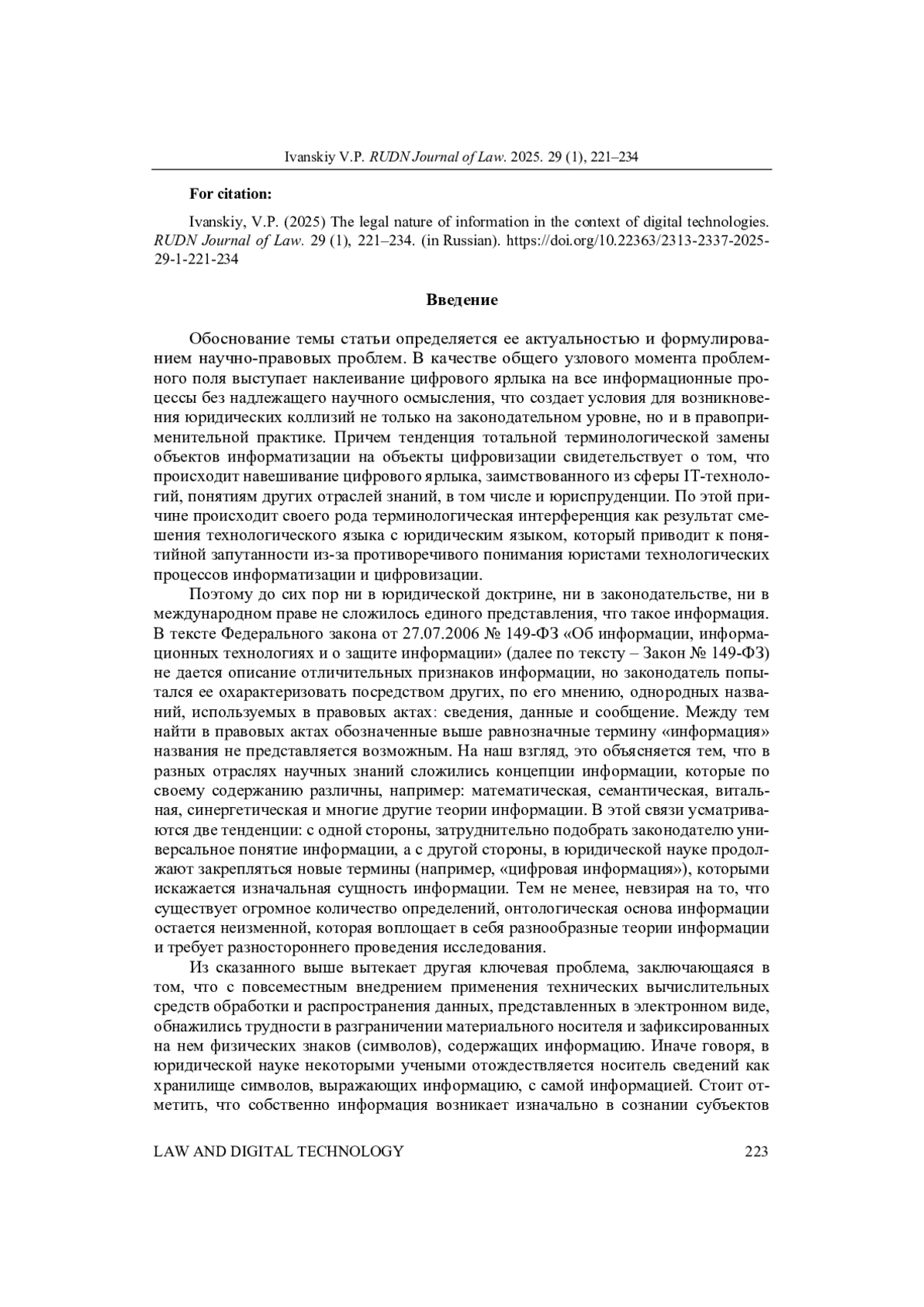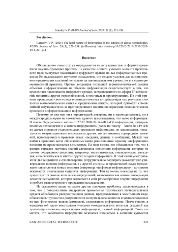 Обоснование темы статьи определяется ее актуальностью и формулированием научно-правовых проблем. В качестве общего узлового момента проблемного поля выступает наклеивание цифрового ярлыка на все информационные процессы без надлежащего научного осмысления, что создает условия для возникновения юридических коллизий не только на законодательном уровне, но и в правоприменительной практике.