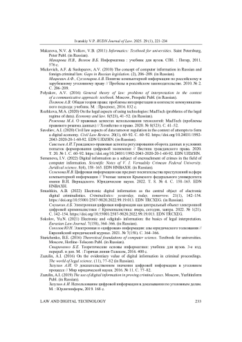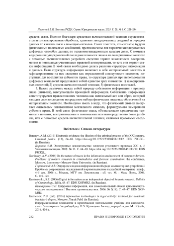 3. 	Кушниренко С.П. Цифровая информация, как самостоятельный объект криминалистического исследования // Вестник криминалистики. 2006. № 2(18). С. 43-47. EDN: XOFMHZ