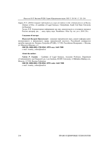 16. 	Зигура Н.В. Компьютерная информация как вид доказательств в уголовном процессе России: автореф. дис. … канд. юрид. наук. Челябинск: Юж.-Ур. гос. ун-т. 2010. 20 c.