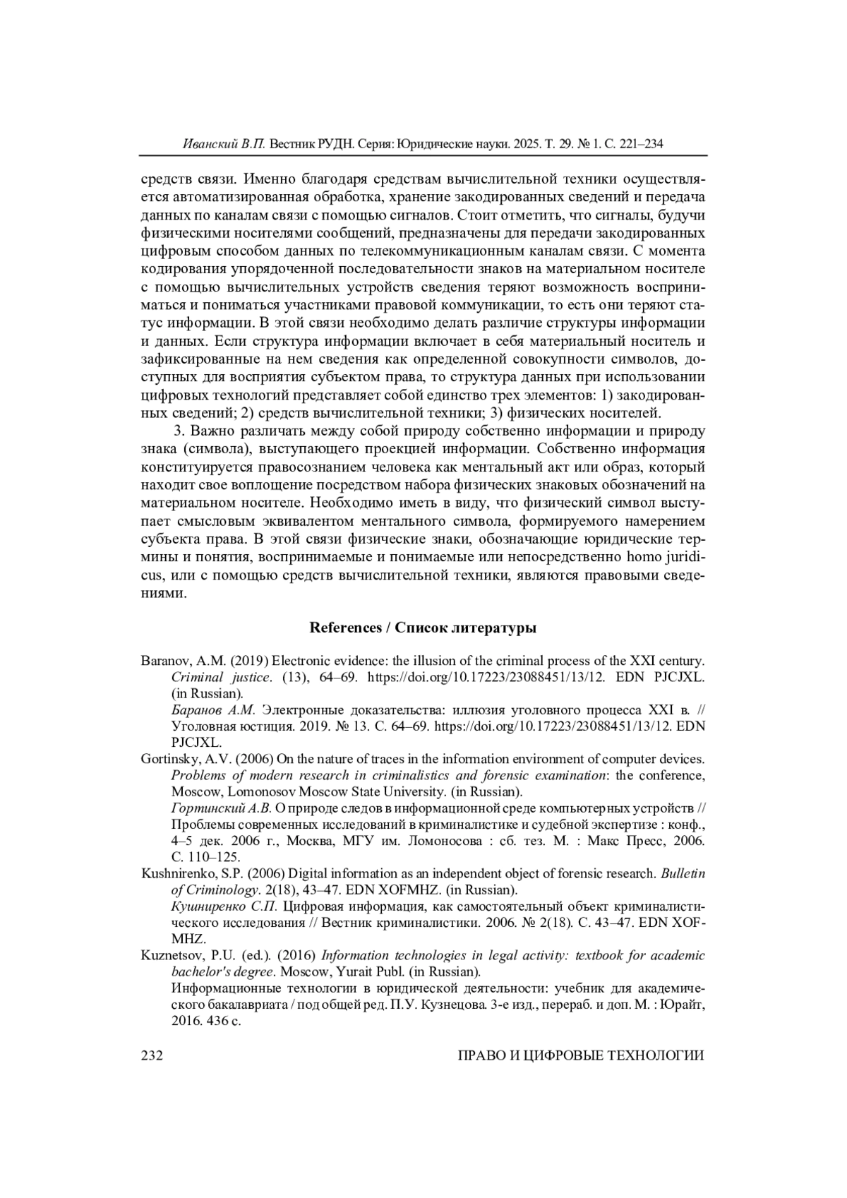 1. 	Баранов А.М. Электронные доказательства: иллюзия уголовного процесса ХХI в. // Уголовная юстиция. 2019. № 13. С. 64-69. DOI: 10.17223/23088451/13/12 EDN: PJCJXL