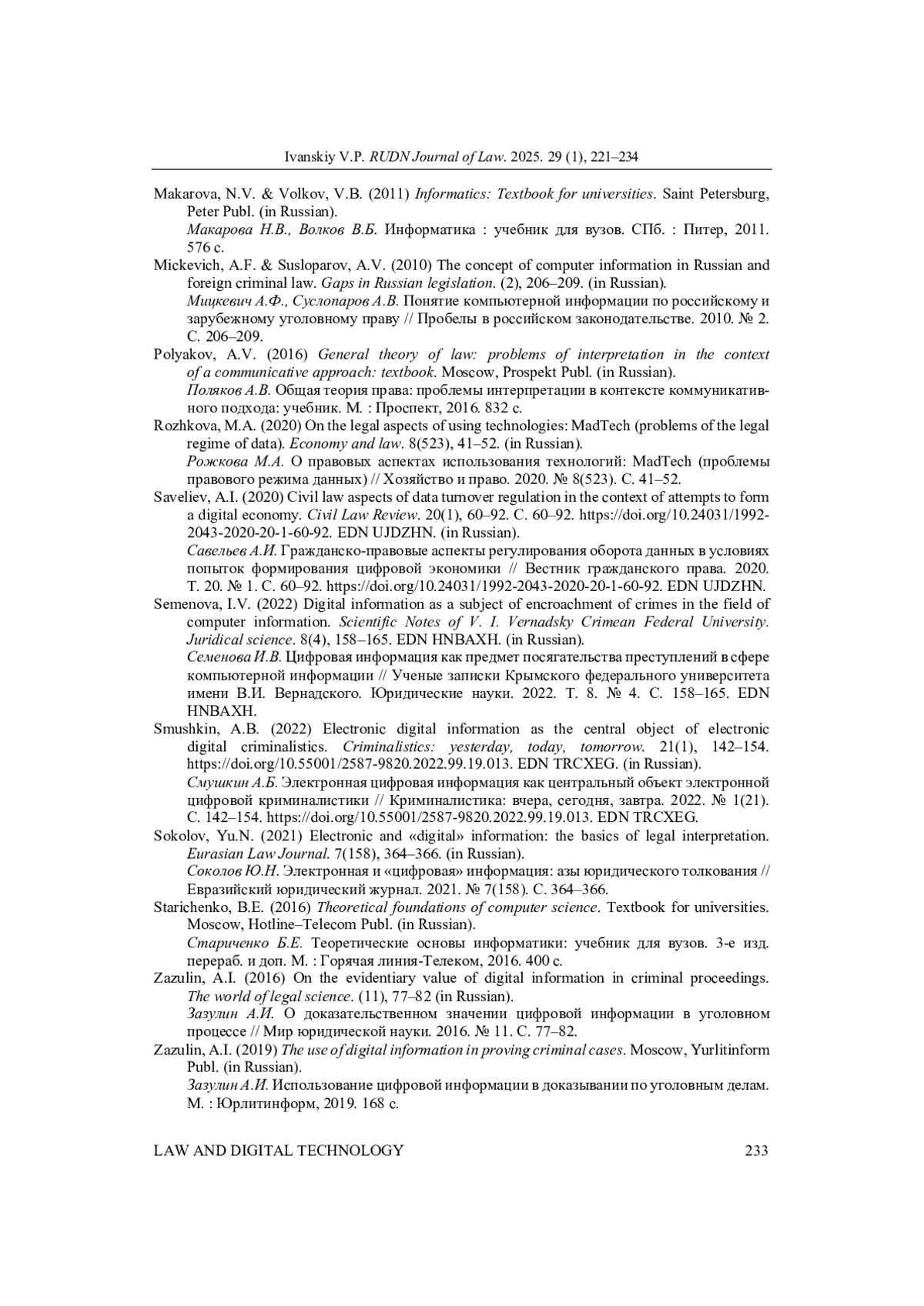 12. 	Соколов Ю.Н. Электронная и “цифровая” информация: азы юридического толкования // Евразийский юридический журнал. 2021. № 7(158). С. 364-366. EDN: WIFDYQ