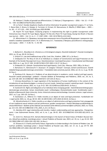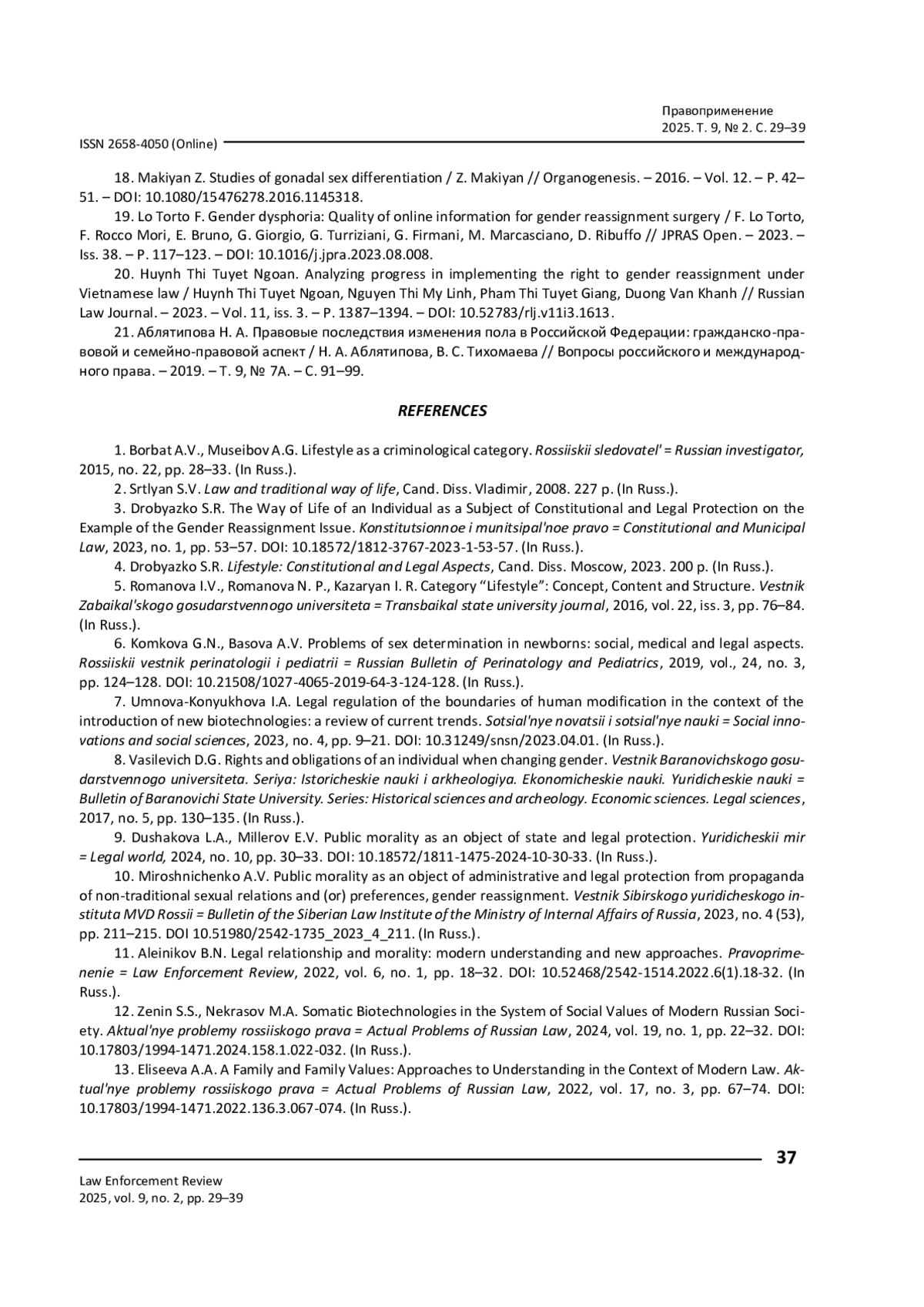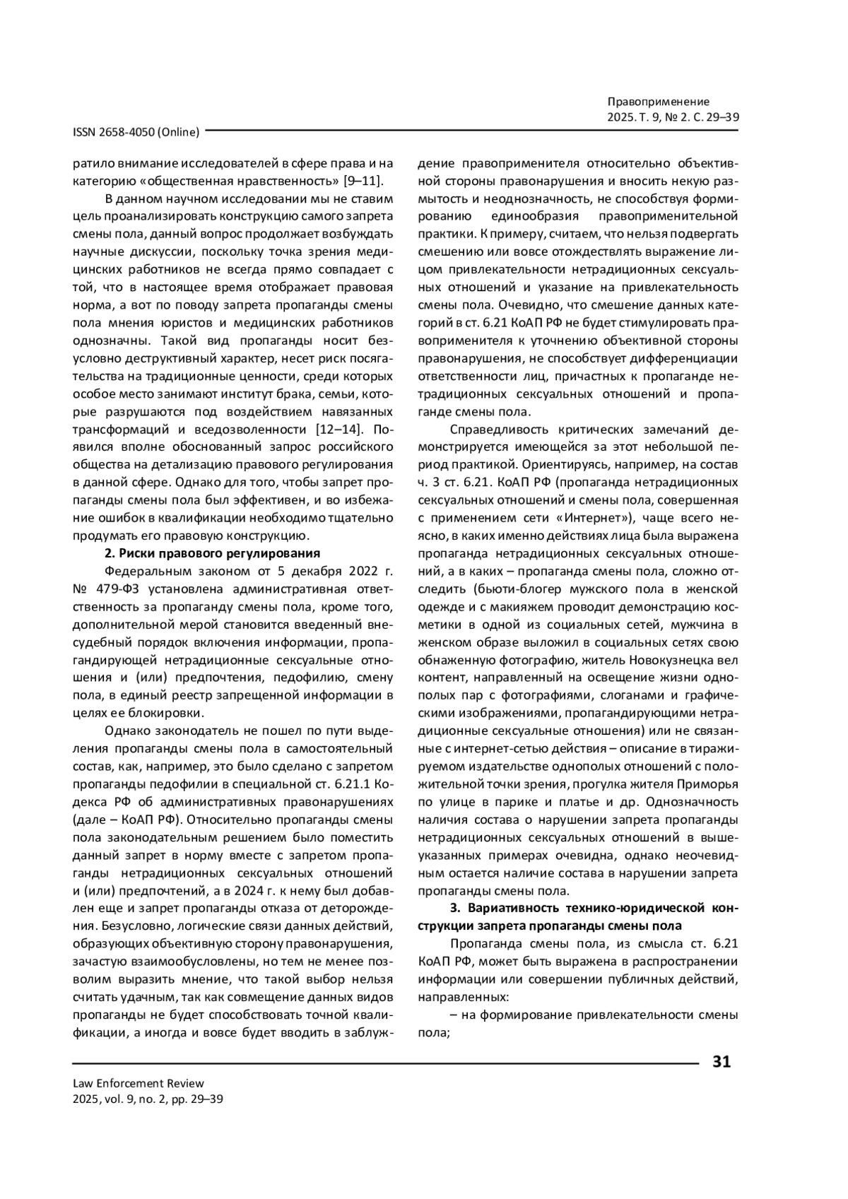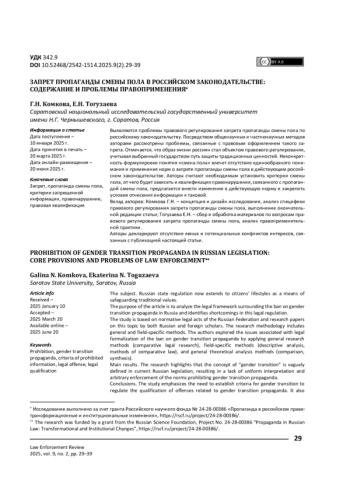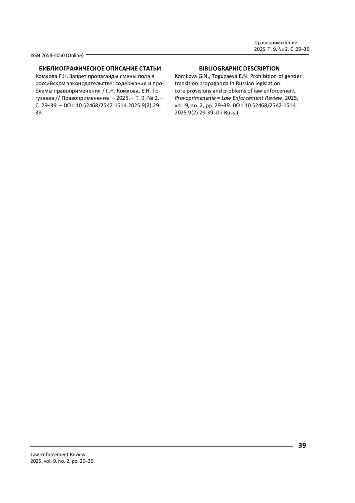 КОМКОВА Г. Н., ТОГУЗАЕВА Е. Н. ЗАПРЕТ ПРОПАГАНДЫ СМЕНЫ ПОЛА В РОССИЙСКОМ ЗАКОНОДАТЕЛЬСТВЕ: СОДЕРЖАНИЕ И ПРОБЛЕМЫ ПРАВОПРИМЕНЕНИЯ // ПРАВОПРИМЕНЕНИЕ. 2025. ТОМ 9, № 2