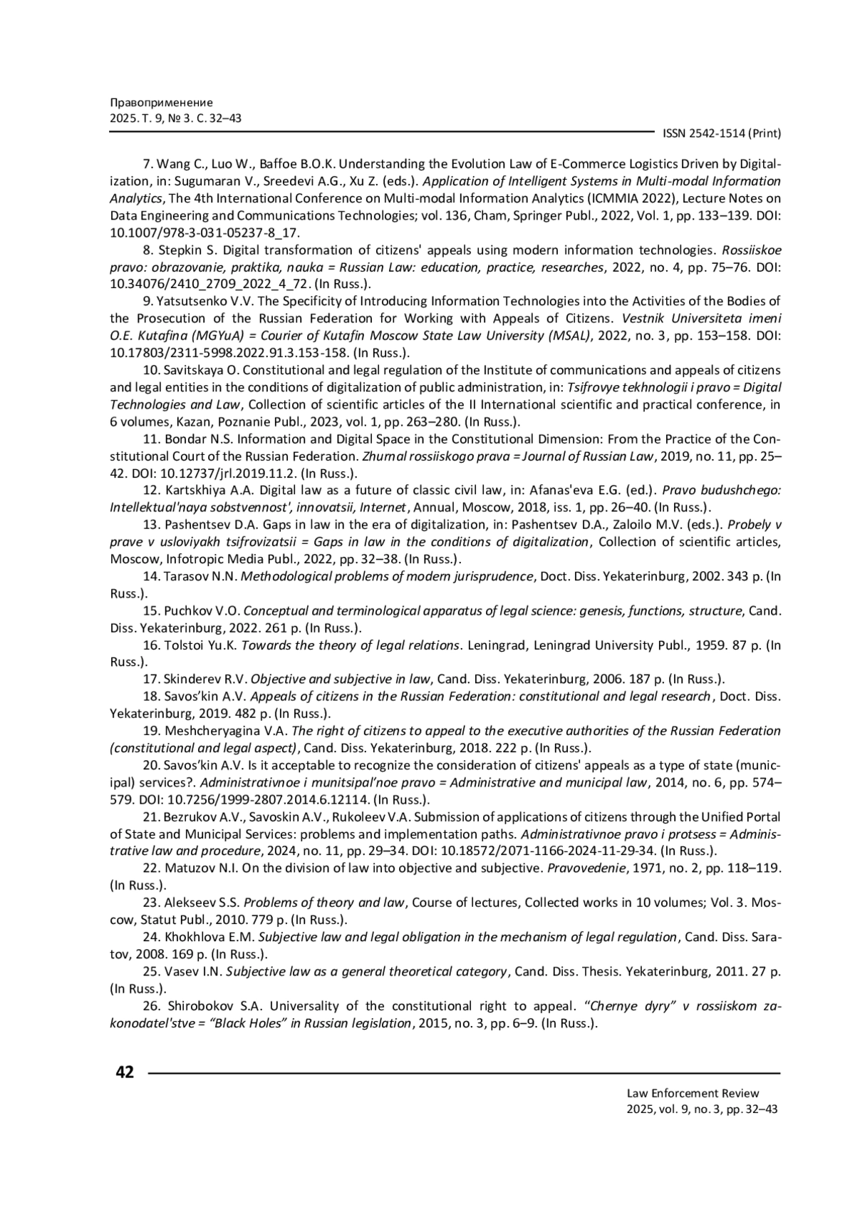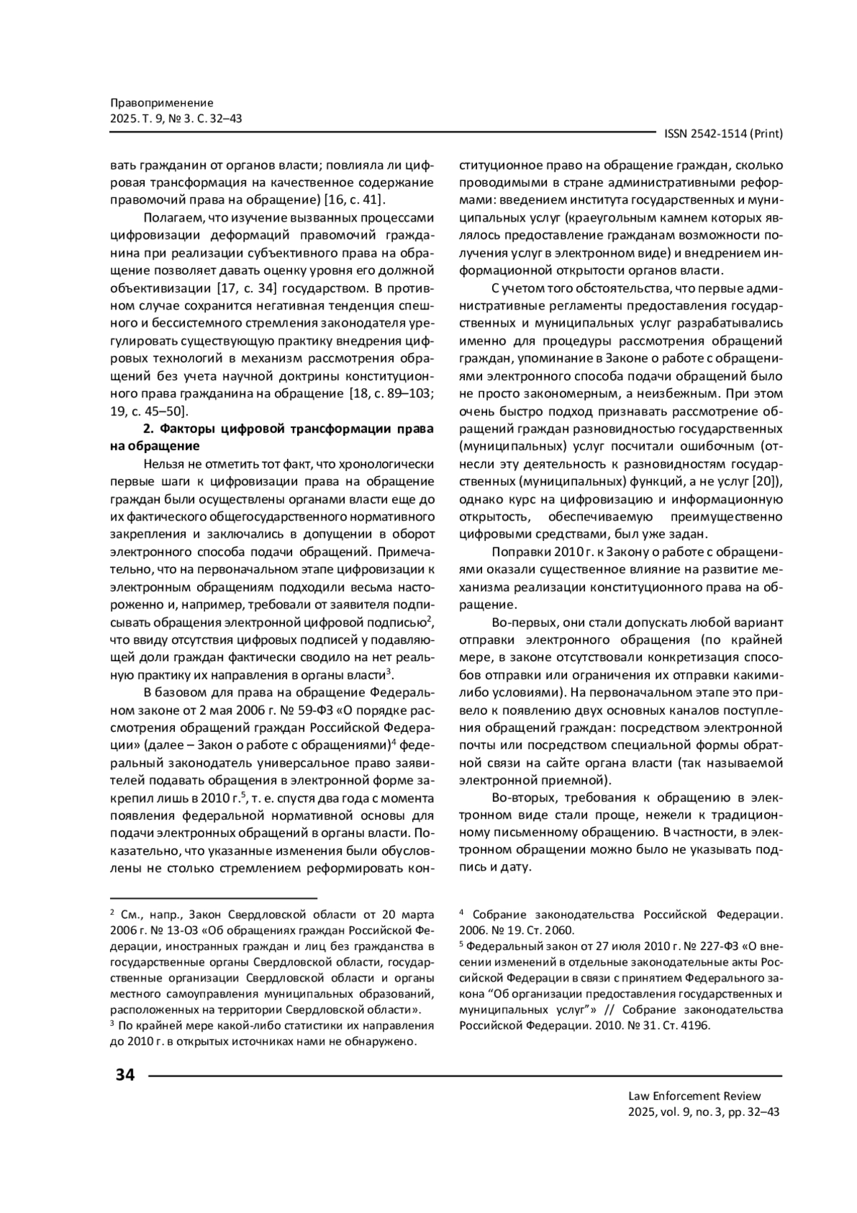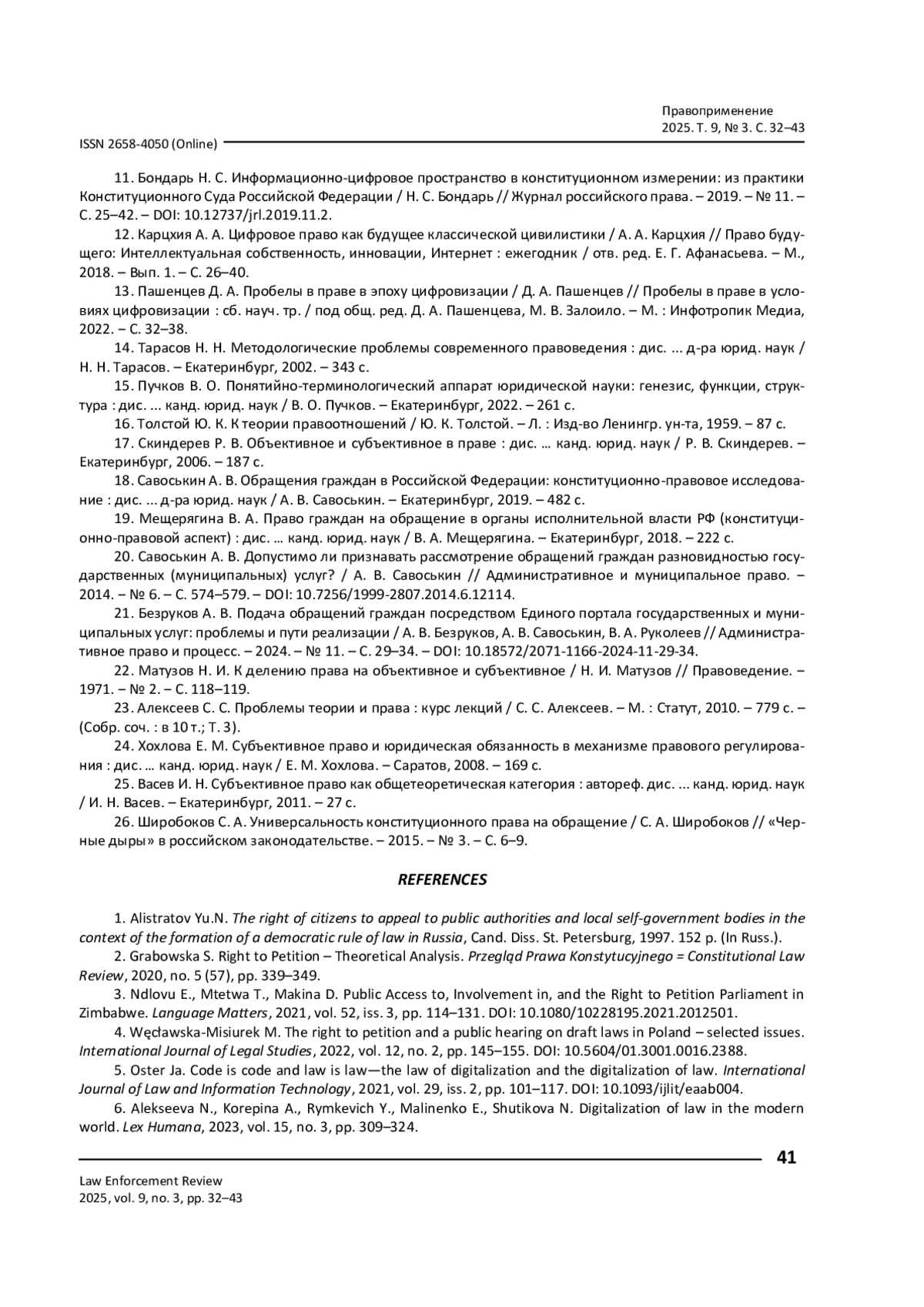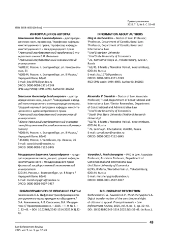 КОЖЕВНИКОВ О. А., САВОСЬКИН А. В., МЕЩЕРЯГИНА В. А. ЦИФРОВАЯ ТРАНСФОРМАЦИЯ КОНСТИТУЦИОННОГО ПРАВА ГРАЖДАН НА ОБРАЩЕНИЕ // ПРАВОПРИМЕНЕНИЕ. 2025. ТОМ 9, № 3