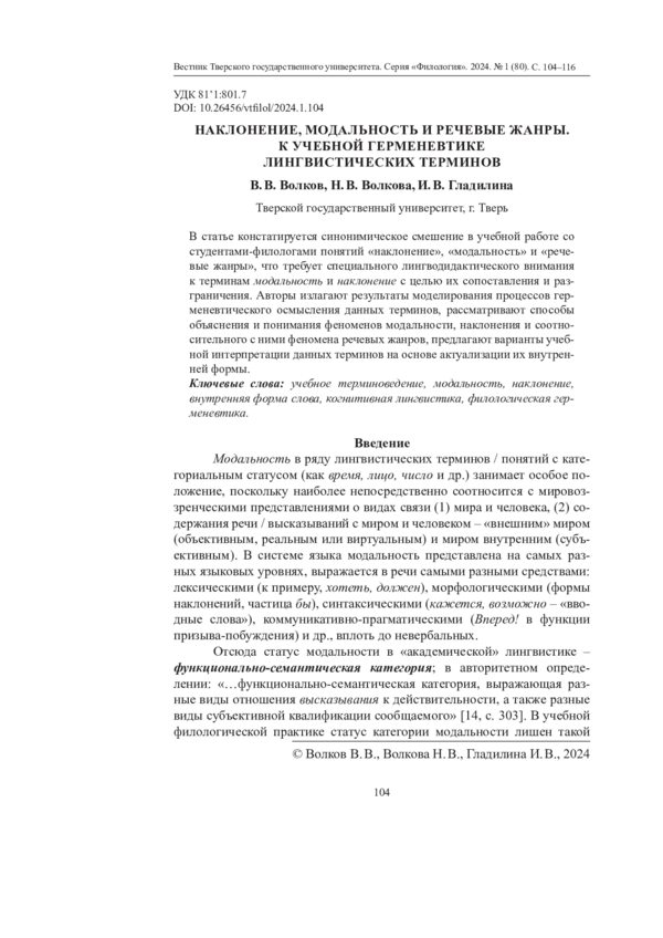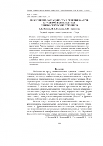 Жанр данной статьи – опыт учебно-герменевтического прочтения ядерной части понятийно-терминологической микросистемы «модальность – наклонение – речевые жанры» в русском языкознании. Конкретный материал – предмет данной работы как относящейся к учебной лингводидактической герменевтике – именования языковых значений, составляющих содержание категорий наклонения и модальности, цель – осмысление трудностей, с которыми сталкиваются студенты-филологи, пытаясь понять, что такое наклонение и модальность, начиная с существа самих терминов наклонение и модальность. Кратко поясним существо ключевых трудностей. Во-первых, на студенческой скамье выясняется, что, помимо «школьных» наклонений (изъявительное, повелительное, сослагательное / условное), в науке используются другие именования каких-то других то ли «наклонений», то ли «модальностей», причем, кроме интуитивно ясных терминов реальная и ирреальная (модальность / наклонение), положительная и отрицательная, вопросительная и утвердительная, прямая и косвенная модальность, используются термины гипотетическая, долженствовательная, допустительная, достигательная, желательная, запретительная, повелительно-предположительная, потенциальная, предостерегательная, разрешительная, увещевательная, эмфатическая и др., которые трактуются то как модальности, то как наклонения, а многие в коммуникативно-прагматической проекции рассматриваются и как речевые жанры, список которых относительно автономен и неопределенно обширен: вопрос и ответ, утверждение и отрицание, разрешение и запрещение, побуждение, предостережение, призыв, пожелание, приглашение, приветствие, просьба и мн. др. (см., например: [13]).