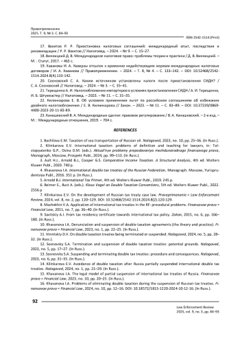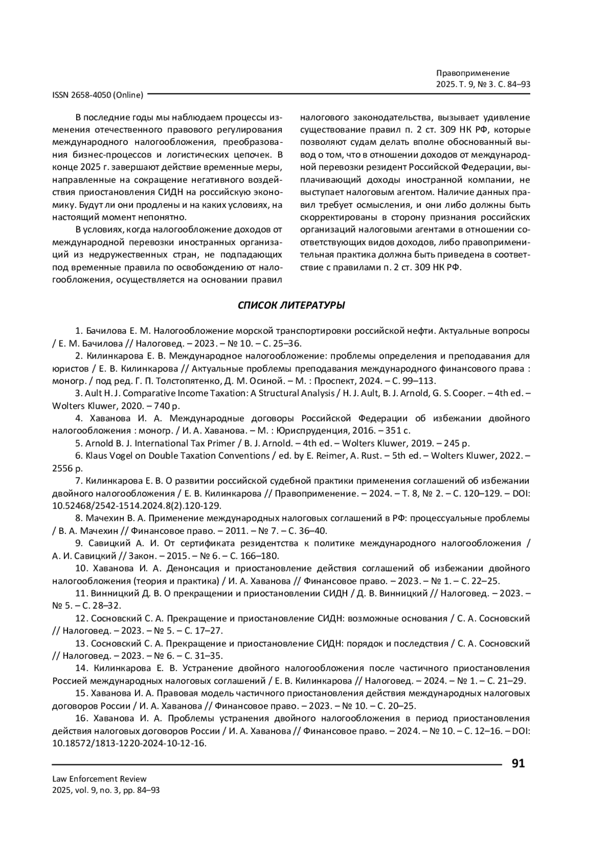 КИЛИНКАРОВА Е. В. НАЛОГООБЛОЖЕНИЕ В РОССИИ ДОХОДОВ НЕРЕЗИДЕНТОВ ОТ МЕЖДУНАРОДНОЙ ПЕРЕВОЗКИ // ПРАВОПРИМЕНЕНИЕ. 2025. ТОМ 9, № 3