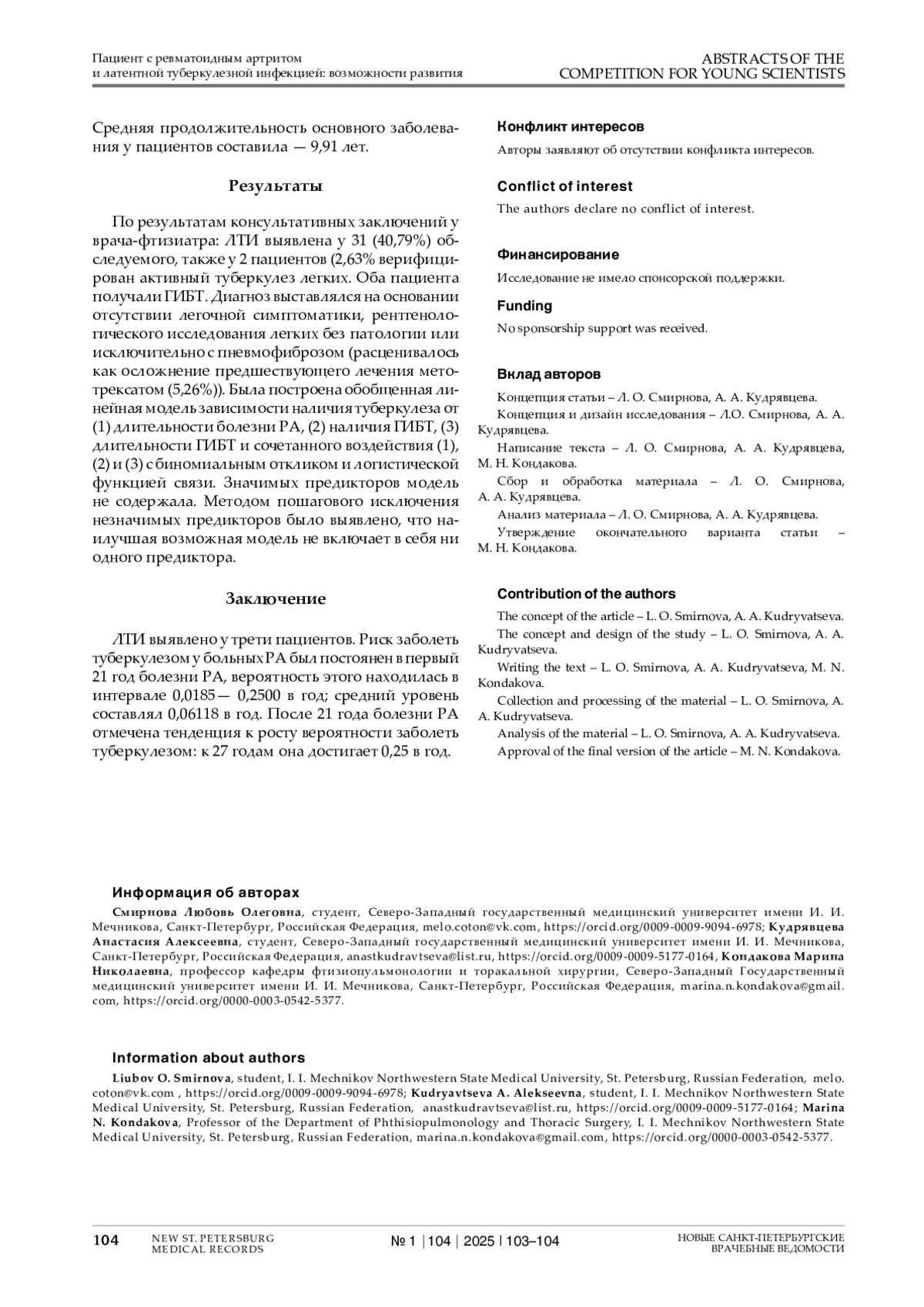 СМИРНОВА Л. О., КУДРЯВЦЕВА А. А., КОНДАКОВА М. Н. ПАЦИЕНТ С РЕВМАТОИДНЫМ АРТРИТОМ И ЛАТЕНТНОЙ ТУБЕРКУЛЕЗНОЙ ИНФЕКЦИЕЙ: ВОЗМОЖНОСТИ РАЗВИТИЯ // НОВЫЕ САНКТ-ПЕТЕРБУРГСКИЕ ВРАЧЕБНЫЕ ВЕДОМОСТИ. 2025. № 1, ТОМ 104