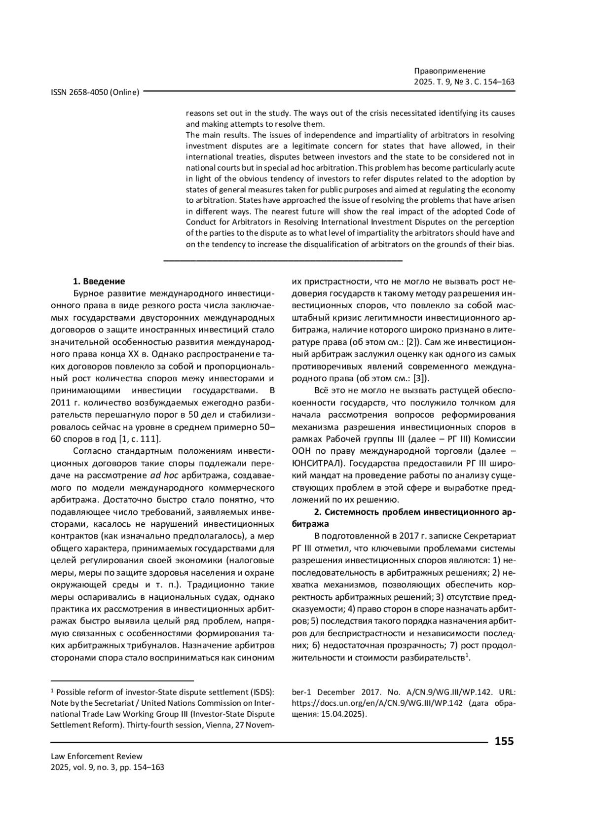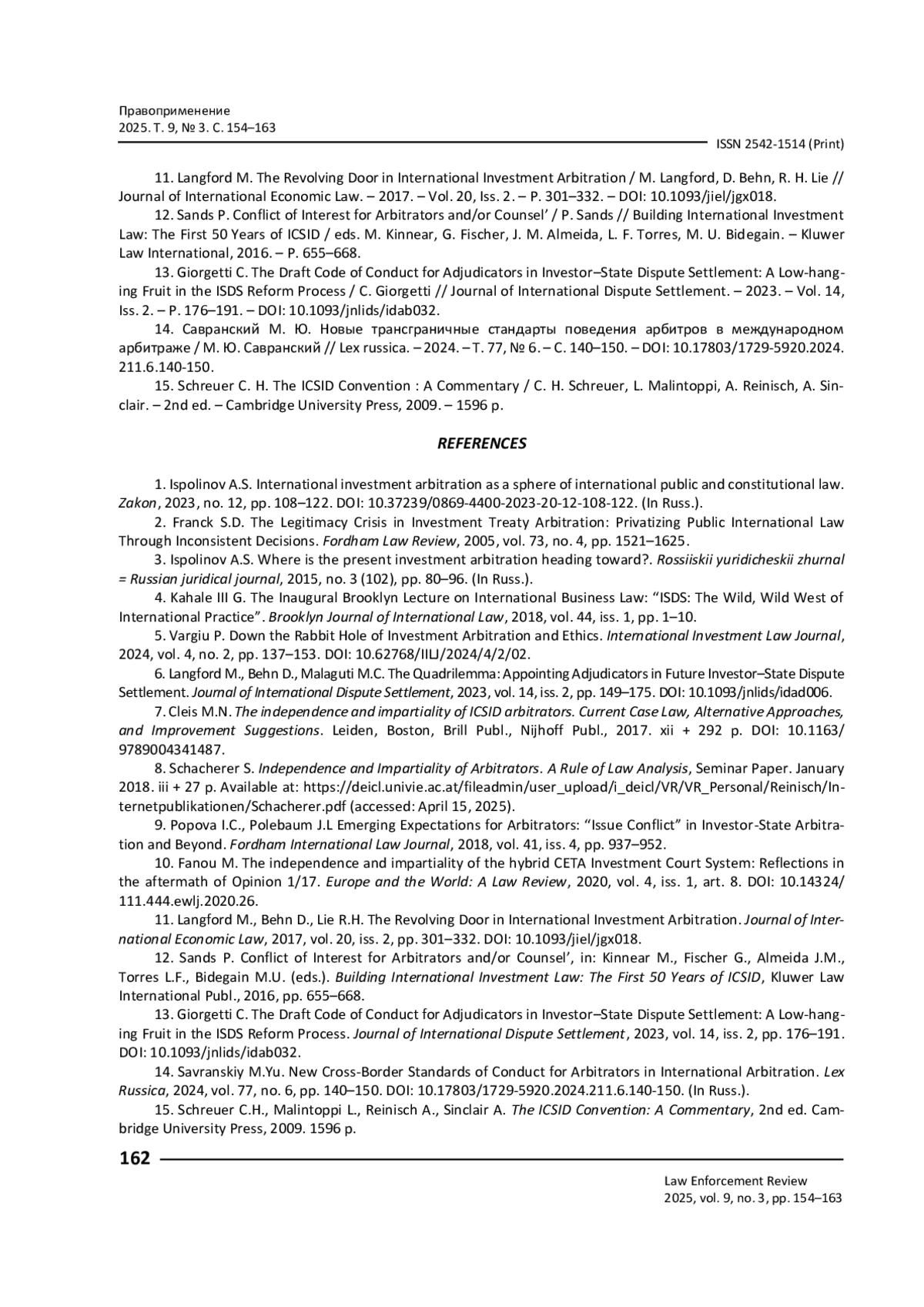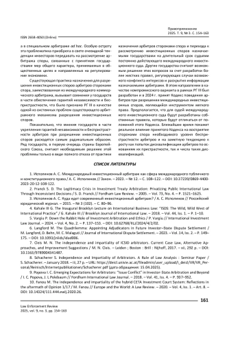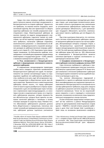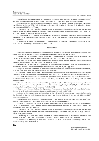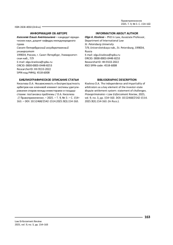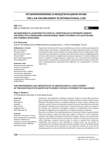 КИСЕЛЕВА О. А. НЕЗАВИСИМОСТЬ И БЕСПРИСТРАСТНОСТЬ АРБИТРОВ КАК КЛЮЧЕВОЙ ЭЛЕМЕНТ СИСТЕМЫ УРЕГУЛИРОВАНИЯ СПОРОВ МЕЖДУ ИНВЕСТОРАМИ И ГОСУДАРСТВАМИ: ПОСТАНОВКА ПРОБЛЕМЫ // ПРАВОПРИМЕНЕНИЕ. 2025. ТОМ 9, № 3