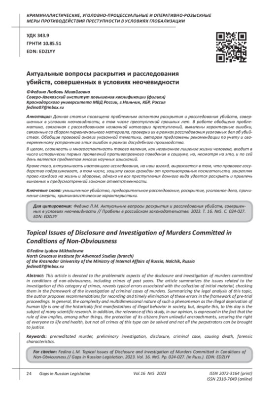 АКТУАЛЬНЫЕ ВОПРОСЫ РАСКРЫТИЯ И РАССЛЕДОВАНИЯ УБИЙСТВ, СОВЕРШЕННЫХ В УСЛОВИЯХ НЕОЧЕВИДНОСТИ