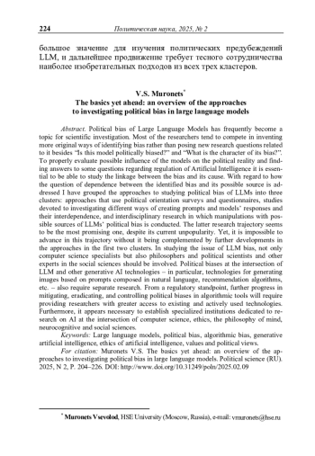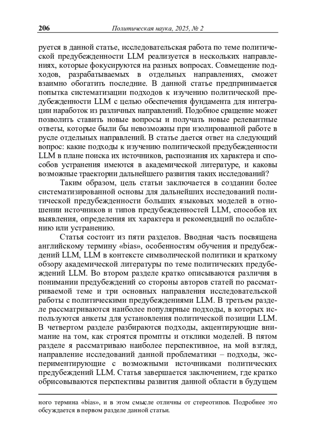 Политические предубеждения больших языковых моделей нередко становились предметом научного рассмотрения. Большинство исследователей, однако, скорее конкурирует в изобретении оригинальных способов выявлять предубеждения, нежели стремится ставить новые вопросы, с ними связанные, кроме: «Предубеждена ли эта модель политически?» и «Каков характер этого предубеждения?». Для оценки возможного влияния моделей на политическую реальность и получения ответов на некоторые вопросы регулирования необходимо также обладать способами изучения связи между предубежденностью и ее причиной. По качеству ответа на вопрос о выявлении зависимости между открытой предубежденностью и ее возможным источником я разделил подходы на три кластера: подходы, задействующие анкеты по определению политической позиции, исследования, посвященные способу составления промптов и откликов модели и их взаимосвязи, а также междисциплинарные исследования, в которых проводятся манипуляции с возможными источниками политических предубеждений больших языковых моделей. Последнее исследовательское направление кжется наиболее перспективным, несмотря на свою непопулярность на данный момент. Тем не менее продвижение в нем невозможно без тесного сотрудничества другими подходами, подпадающими под первые два кластера. К исследованиям проблемы предубеждений LLM должны привлекаться не только специалисты по компьютерным наукам, но и философы, политологи и другие специалисты в области социальных наук. Отдельного изучения также требуют политические предубеждения на стыке LLM и других технологий генеративного ИИ, в частности, технологий генерации изображений на основе промптов, составленных на естественном языке, рекомендательных алгоритмов и т. д. С точки зрения регулирования дальнейшее продвижение в области ослабления, искоренения и контроля политических предубеждений в алгоритмических инструментах потребует предоставления большего доступа исследователей к существующим и активно использующимся технологиям. Кроме того, кажется необходимым создание специальных институтов, посвященных изучению ИИ на стыке компьютерных наук, этики, философии сознания, нейрокогнитивных и социальных наук.