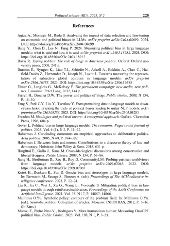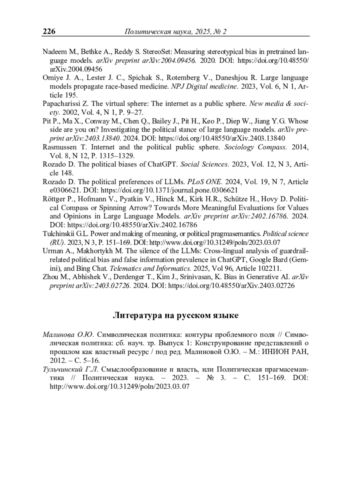 2. Тульчинский Г.Л. Смыслообразование и власть, или Политическая прагмасемантика // Политическая наука. - 2023. - № 3. - С. 151-169. https://doi.org/http://www.doi.org/10.31249/poln/2023.03.07