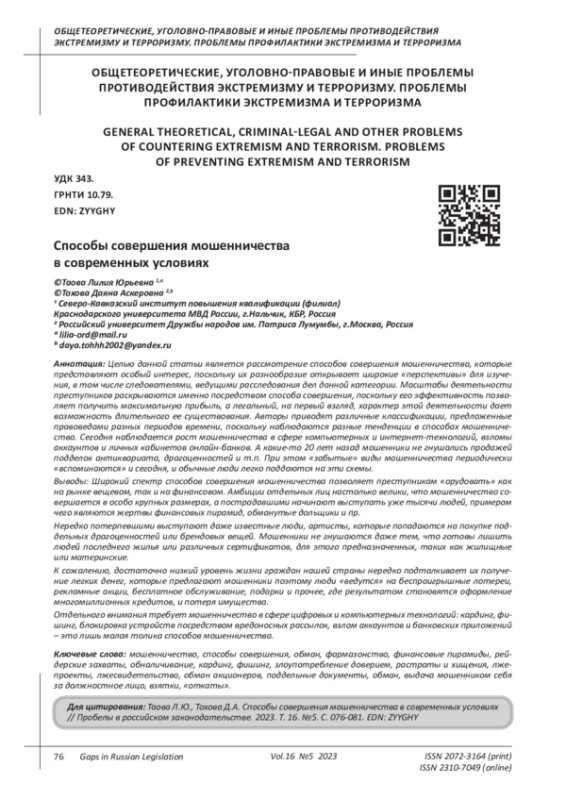 Целью данной статьи является рассмотрение способов совершения мошенничества, которые представляют особый интерес, поскольку их разнообразие открывает широкие «перспективы» для изучения, в том числе следователями, ведущими расследования дел данной категории. Масштабы деятельности преступников раскрываются именно посредством способа совершения, поскольку его эффективность позволяет получить максимальную прибыль, а легальный, на первый взгляд, характер этой деятельности дает возможность длительного ее существования. Авторы приводят различные классификации, предложенные правоведами разных периодов времени, поскольку наблюдаются разные тенденции в способах мошенничества. Сегодня наблюдается рост мошенничества в сфере компьютерных и интернет-технологий, взломы аккаунтов и личных кабинетов онлайн-банков. А какие-то 20 лет назад мошенники не гнушались продажей подделок антиквариата, драгоценностей и т. п. При этом «забытые» виды мошенничества периодически «вспоминаются» и сегодня, и обычные люди легко поддаются на эти схемы. Выводы: Широкий спектр способов совершения мошенничества позволяет преступникам «орудовать» как на рынке вещевом, так и на финансовом. Амбиции отдельных лиц настолько велики, что мошенничество совершается в особо крупных размерах, а пострадавшими начинают выступать уже тысячи людей, примером чего являются жертвы финансовых пирамид, обманутые дольщики и пр. Нередко потерпевшими выступают даже известные люди, артисты, которые попадаются на покупке поддельных драгоценностей или брендовых вещей. Мошенники не гнушаются даже тем, что готовы лишить людей последнего жилья или различных сертификатов, для этого предназначенных, таких как жилищные или материнские. К сожалению, достаточно низкий уровень жизни граждан нашей страны нередко подталкивает их получение легких денег, которые предлагают мошенники поэтому люди «ведутся» на беспроигрышные лотереи, рекламные акции, бесплатное обслуживание, подарки и прочее, где результатом становятся оформление многомиллионных кредитов, и потеря имущества. Отдельного внимания требует мошенничество в сфере цифровых и компьютерных технологий: кардинг, фишинг, блокировка устройств посредством вредоносных рассылок, взлом аккаунтов и банковских приложений - это лишь малая толика способов мошенничества.