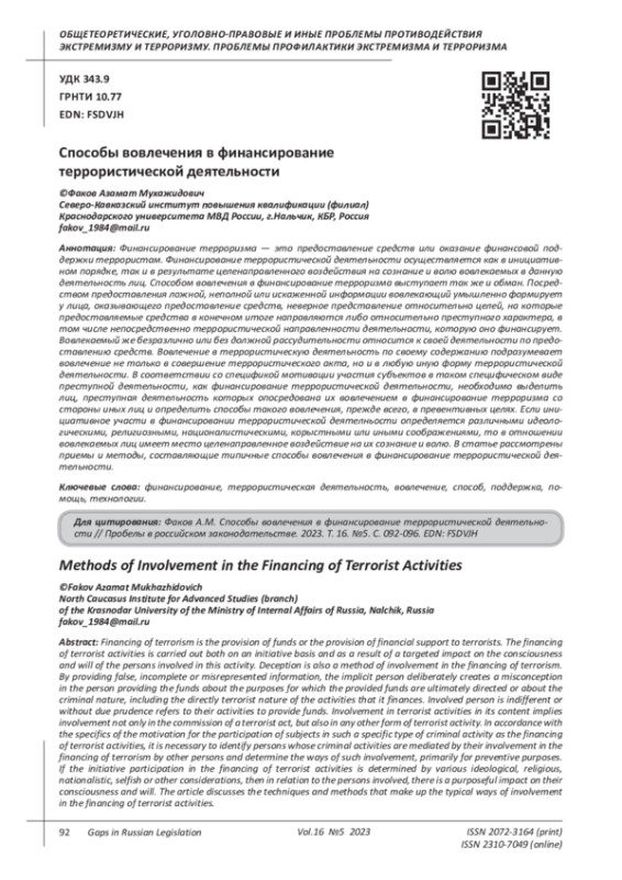 Fakov A.M. The concept and types of technologies for financing terrorist activities // Humanitarian, socio-economic and social sciences. 2022. No. 12. P. 253-257. EDN: FKVFNW