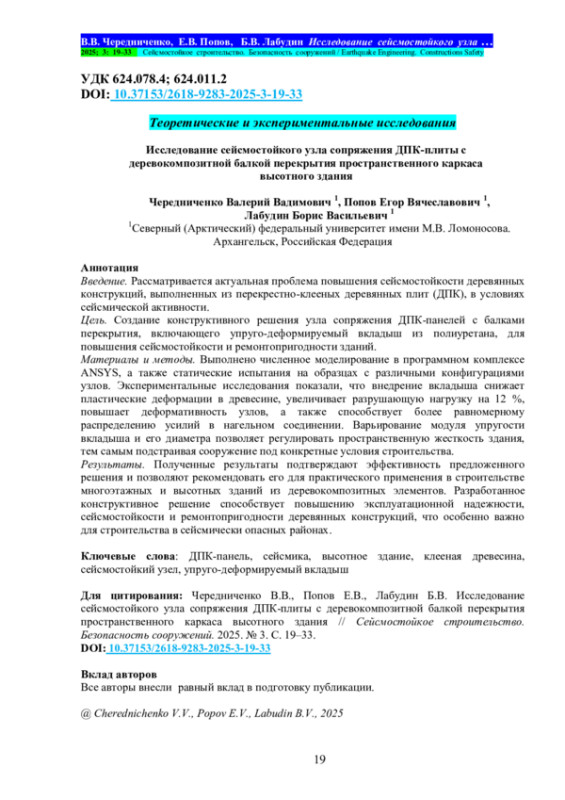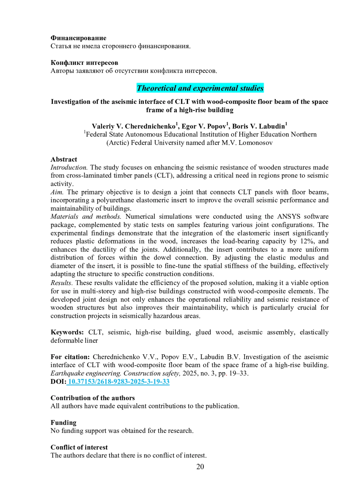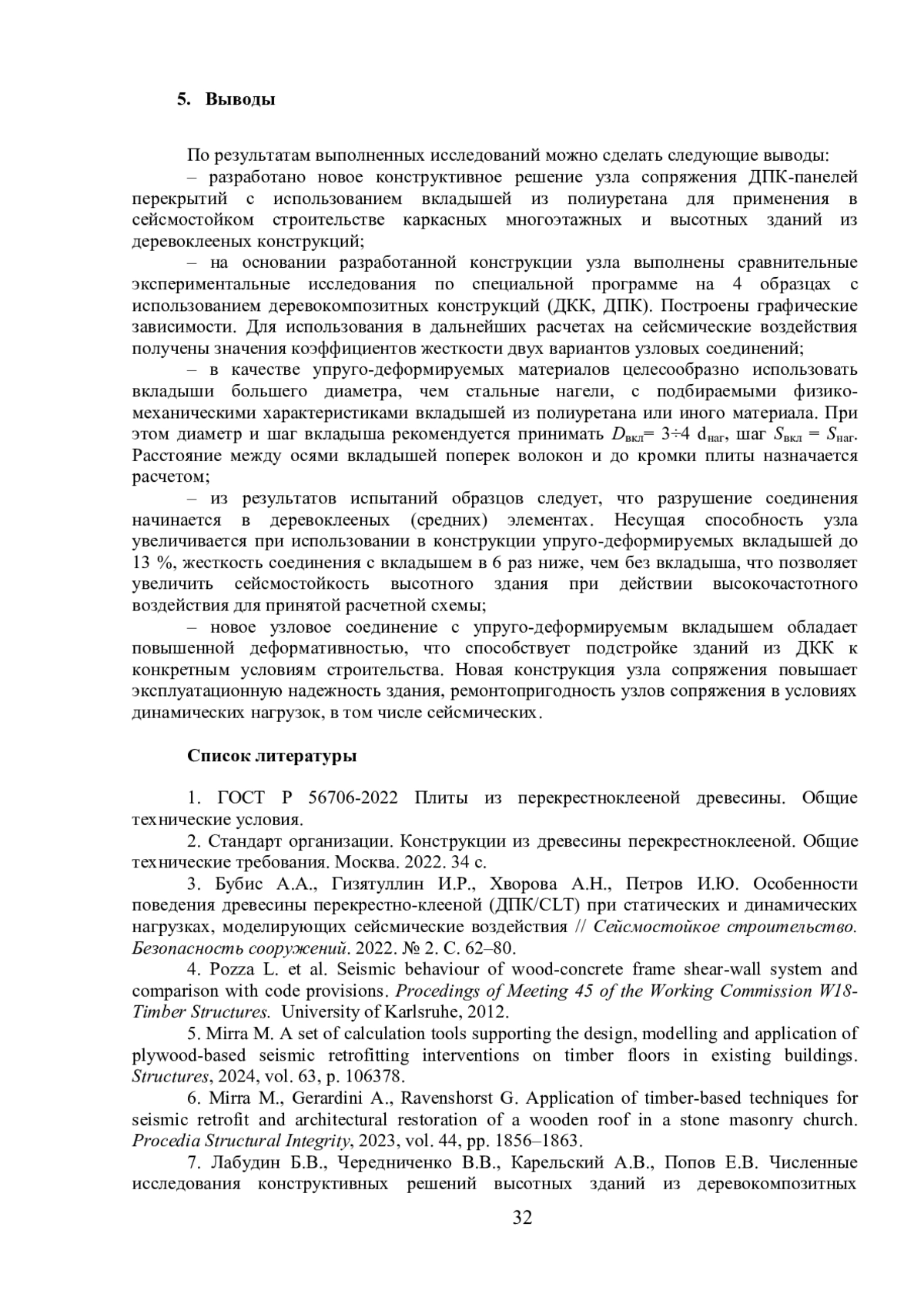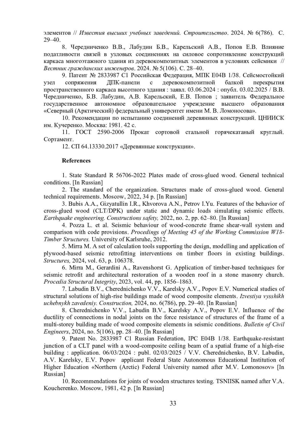 7. Лабудин Б.В., Чередниченко В.В., Карельский А.В., Попов Е.В. Численные исследования конструктивных решений высотных зданий из деревокомпозитных элементов // Известия высших учебных заведений. Строительство. 2024. № 6(786). С. 29-40.