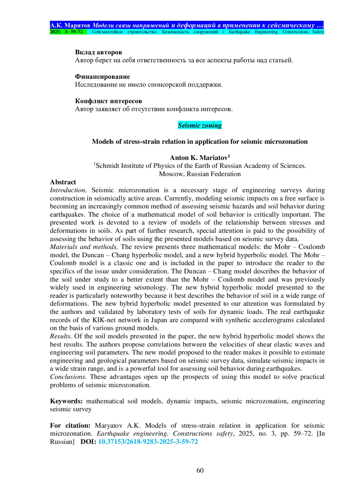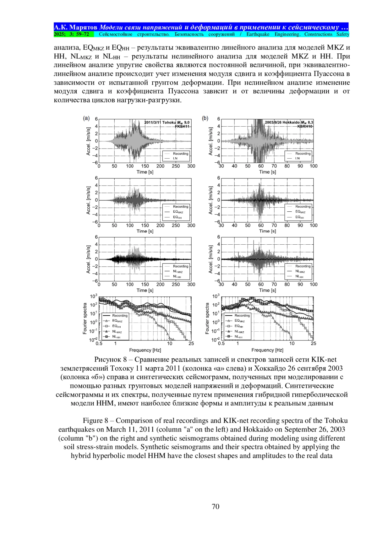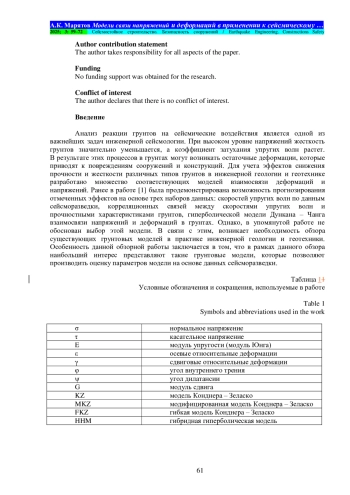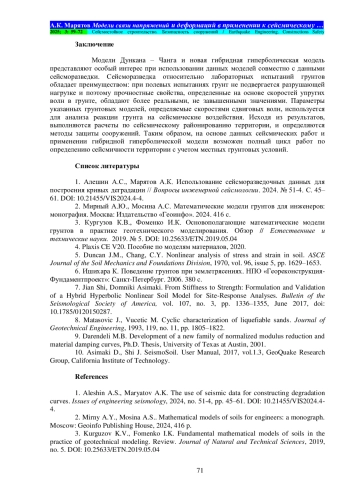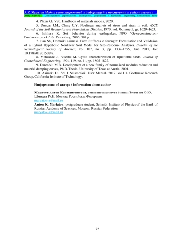 Материалы и методы. В обзоре представлены три математические модели: модель Кулона – Мора, гиперболическая модель Дункана – Чанга и новая гибридная гиперболическая модель. Модель Кулона – Мора является классической и включена в работу для введения читателя в специфику рассматриваемого вопроса. Модель Дункана –Чанга в лучшей степени, чем модель Кулона – Мора, описывает поведение исследуемого грунта и ранее широко использовалась в работах по инженерной сейсмологии. Представляемая новая гибридная гиперболическая модель особенно примечательна тем, что наилучшим образом описывает поведение грунта в широком диапазоне деформаций. Новая гибридная гиперболическая модель сформулирована авторами и валидирована лабораторными испытаниями грунтов на динамические нагрузки. Реальные записи землетрясений сети KIK-net в Японии сравниваются с синтетическими акселерограммами, рассчитанными на основе различных грунтовых моделей. Из представленных в работе грунтовых моделей, новая гибридная гиперболическая модель показывает наилучшие результаты. Авторами предлагаются корреляционные зависимости между скоростями поперечных упругих волн с инженерно-геологическими параметрами.