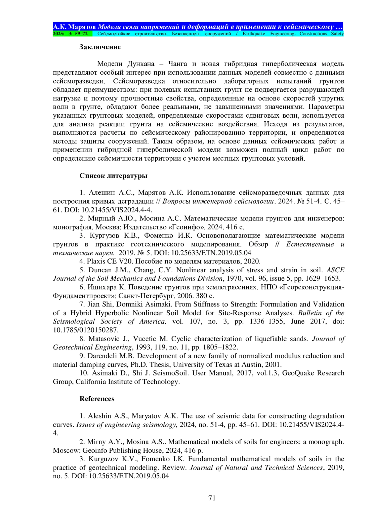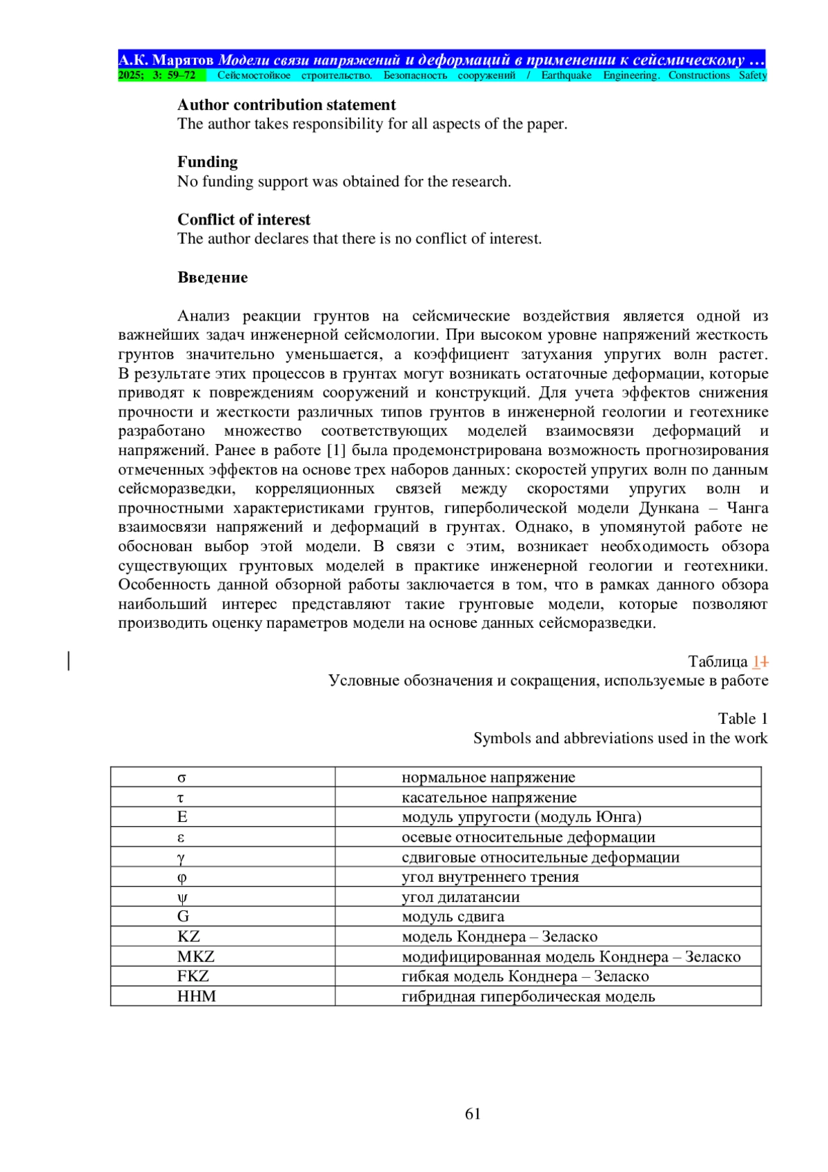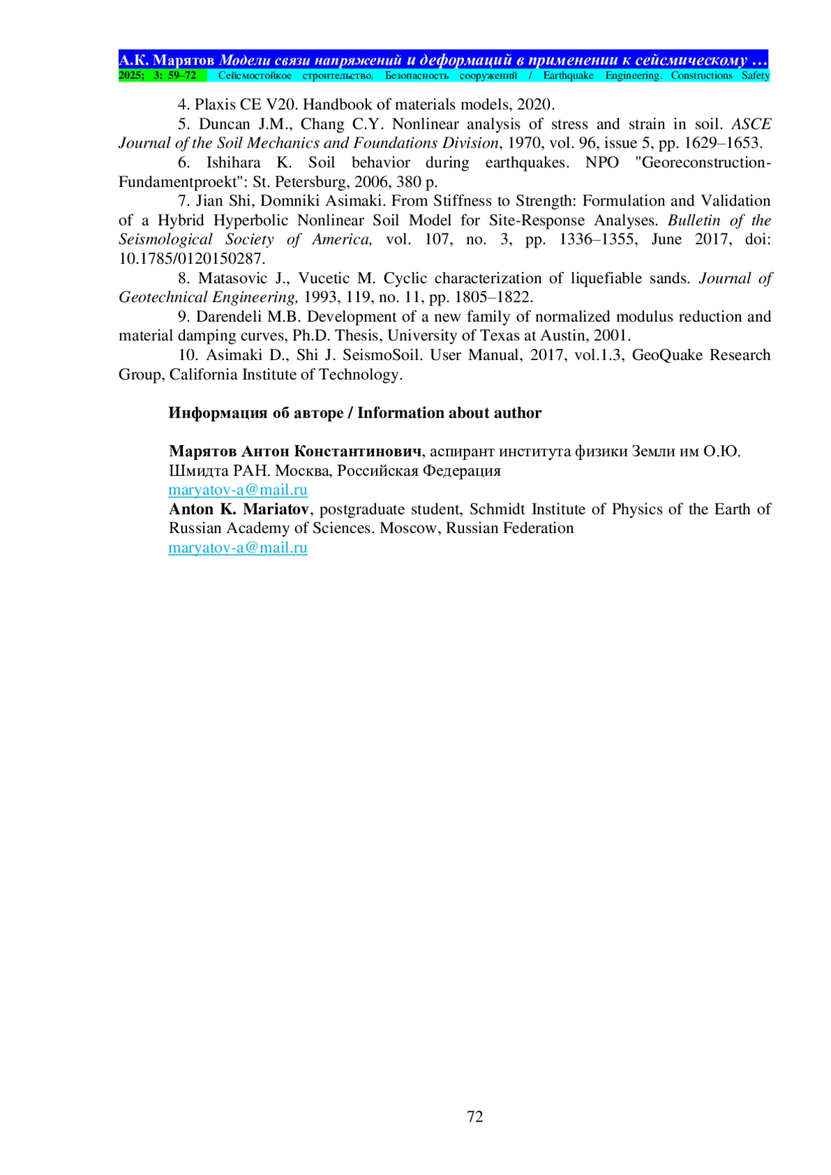 Материалы и методы. В обзоре представлены три математические модели: модель Кулона – Мора, гиперболическая модель Дункана – Чанга и новая гибридная гиперболическая модель. Модель Кулона – Мора является классической и включена в работу для введения читателя в специфику рассматриваемого вопроса. Модель Дункана –Чанга в лучшей степени, чем модель Кулона – Мора, описывает поведение исследуемого грунта и ранее широко использовалась в работах по инженерной сейсмологии. Представляемая новая гибридная гиперболическая модель особенно примечательна тем, что наилучшим образом описывает поведение грунта в широком диапазоне деформаций. Новая гибридная гиперболическая модель сформулирована авторами и валидирована лабораторными испытаниями грунтов на динамические нагрузки. Реальные записи землетрясений сети KIK-net в Японии сравниваются с синтетическими акселерограммами, рассчитанными на основе различных грунтовых моделей. Из представленных в работе грунтовых моделей, новая гибридная гиперболическая модель показывает наилучшие результаты. Авторами предлагаются корреляционные зависимости между скоростями поперечных упругих волн с инженерно-геологическими параметрами.