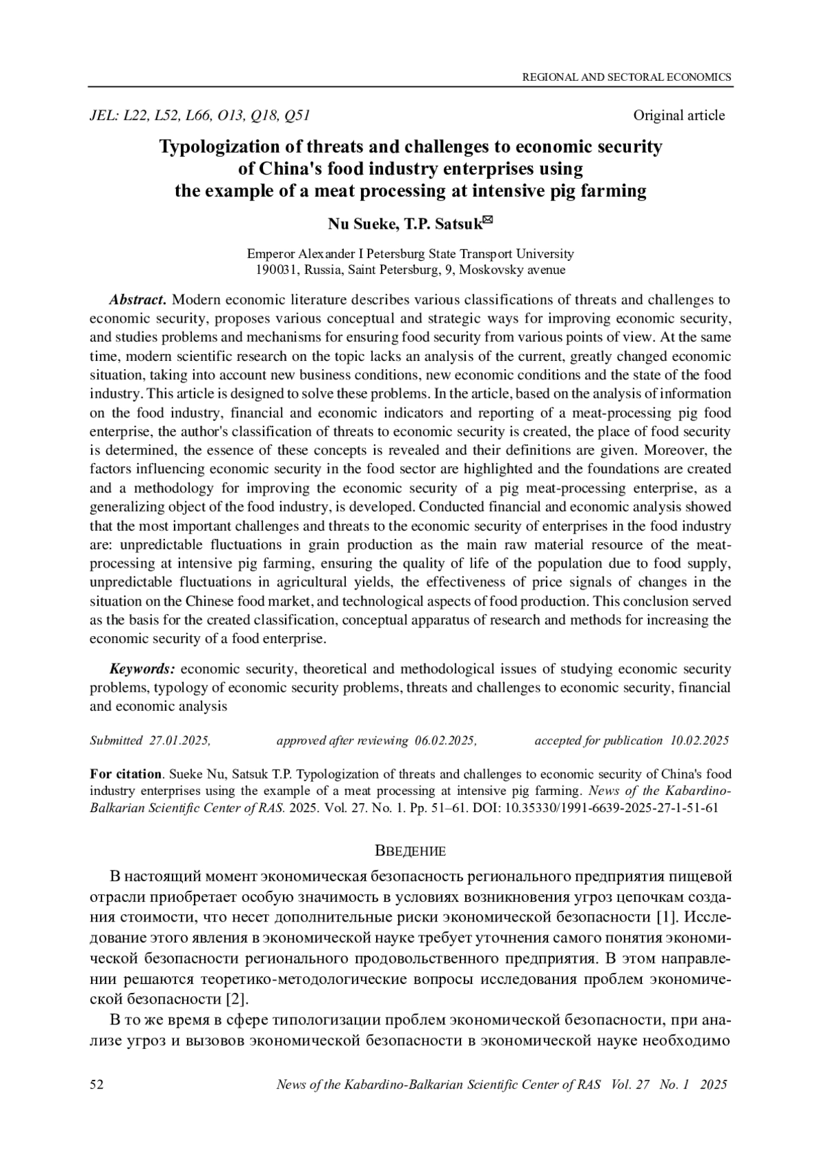 В современной экономической литературе описываются различные классификации угроз и вызовов экономической безопасности, предложены различные концептуальные и стратегические направления повышения экономической безопасности, изучаются с различных точек зрения проблемы и механизмы обеспечения продовольственной безопасности. В то же время в современных научных исследованиях по теме не хватает анализа современной, сильно изменившейся экономической ситуации, учета новых условий хозяйствования, новой экономической конъюнктуры и состояния пищевой отрасли. Настоящая статья призвана решить эти проблемы. В статье на основе анализа информации по пищевой отрасли, финансово -экономических показателей и отчетности мясоперерабатывающего свиноводческого пищевого предприятия создана авторская классификация угроз экономической безопасности, определено место продовольственной безопасности, раскрыта сущность этих понятий и даны их определения. Отдельно выделены факторы, влияющие на экономическую безопасность в продовольственной сфере, созданы основы и разработана методика повышения экономической безопасности свиноводческого мясоперерабатывающего предприятия как обобщающего объекта пищевой отрасли. Проведенный финансово-экономический анализ показал, что наиболее важными вызовами и угрозами экономической безопасности предприятий пищевой отрасли являются: непредсказуемые колебания при производстве зерна как основного сырьевого ресурса мясоперерабатывающего свиноводческого комплекса, обеспечение качества жизни населения за счет продовольственного снабжения, непрогнозируемые перепады урожайности в сельском хозяйстве, эффективность ценовых сигналов изменения конъюнктуры продовольственного рынка Китая, технологические аспекты производства продовольственной продукции. Этот вывод послужил основой для созданной классификации, понятийного аппарата исследования и методики повышения экономической безопасности пищевого предприятия.