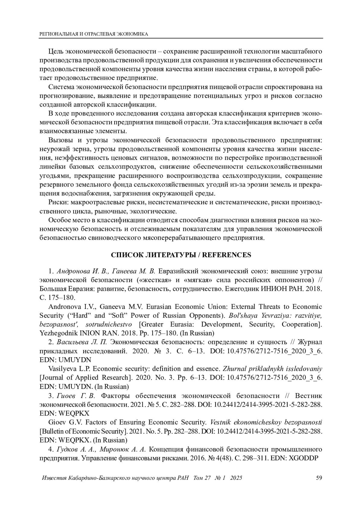 1. Андронова И. В., Ганеева М. В. Евразийский экономический союз: внешние угрозы экономической безопасности (“жесткая” и “мягкая” сила российских оппонентов) // Большая Евразия: развитие, безопасность, сотрудничество. Ежегодник ИНИОН РАН. 2018. С. 175-180. EDN: YRYOGE Andronova I.V., Ganeeva M.V. Eurasian Economic Union: External Threats to Economic Security (“Hard” and “Soft” Power of Russian Opponents). Bol’shaya Yevraziya: razvitiye, bezopasnost’, sotrudnichestvo [Greater Eurasia: Development, Security, Cooperation]. Yezhegodnik INION RAN. 2018. Pp. 175-180. (In Russian).