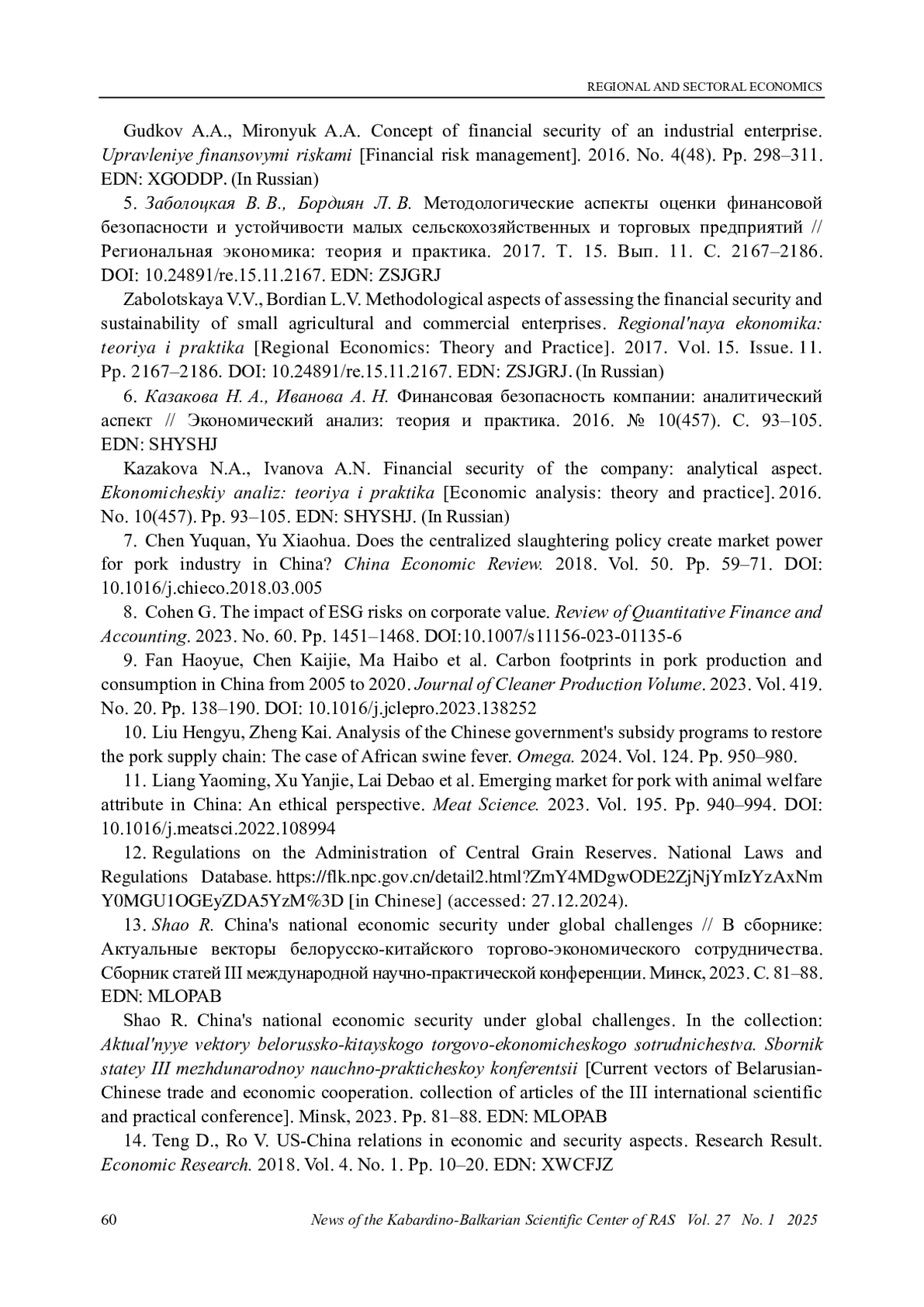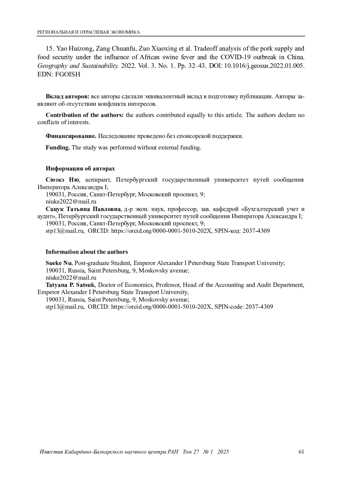 16. Yao Huizong, Zang Chuanfu, Zuo Xiaoxing et al. Tradeoff analysis of the pork supply and food security under the influence of African swine fever and the COVID-19 outbreak in China. Geography and Sustainability. 2022. Vol. 3. No. 1. Pp. 32-43. DOI: 10.1016/j.geosus.2022.01.005 EDN: FGOISH