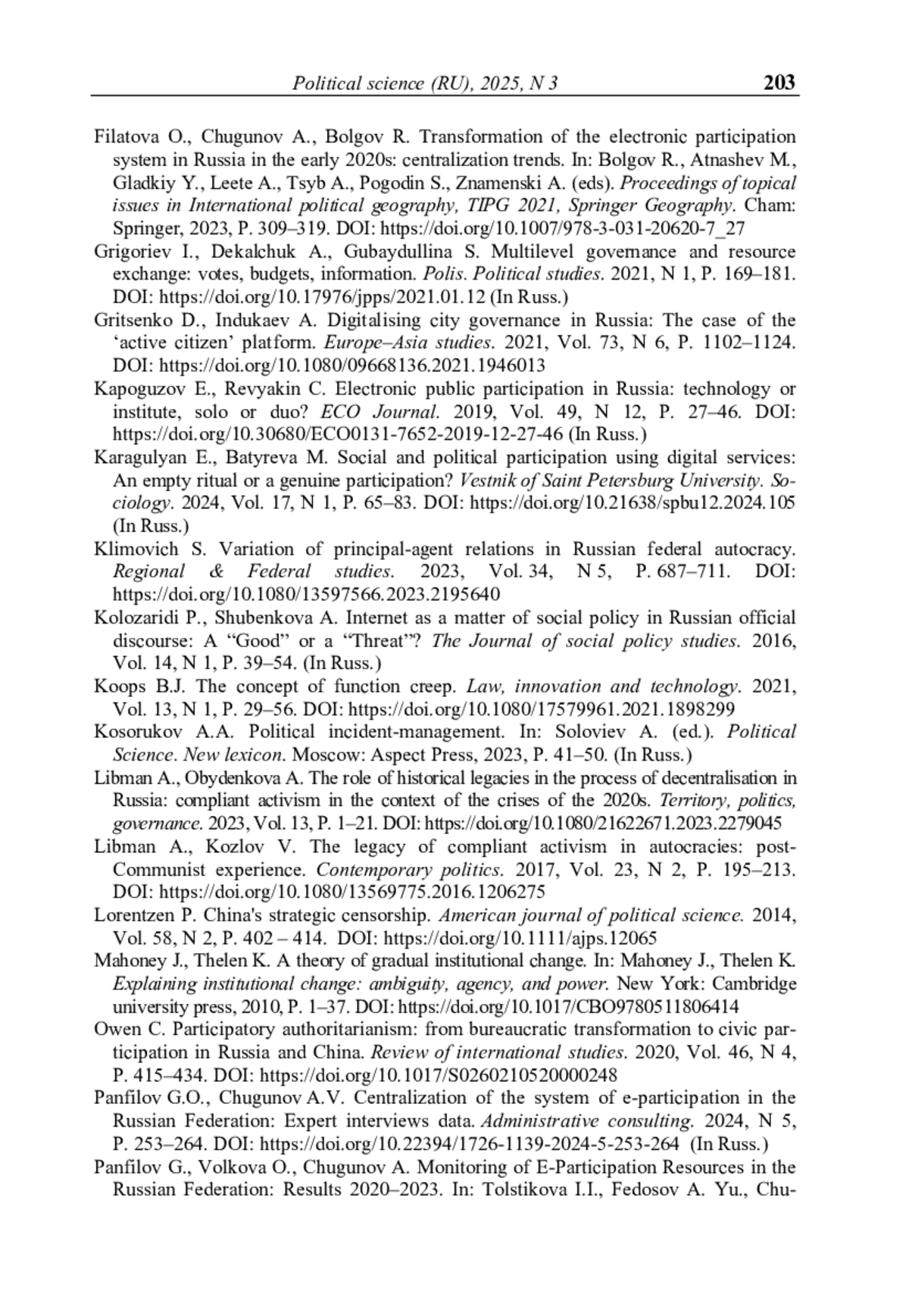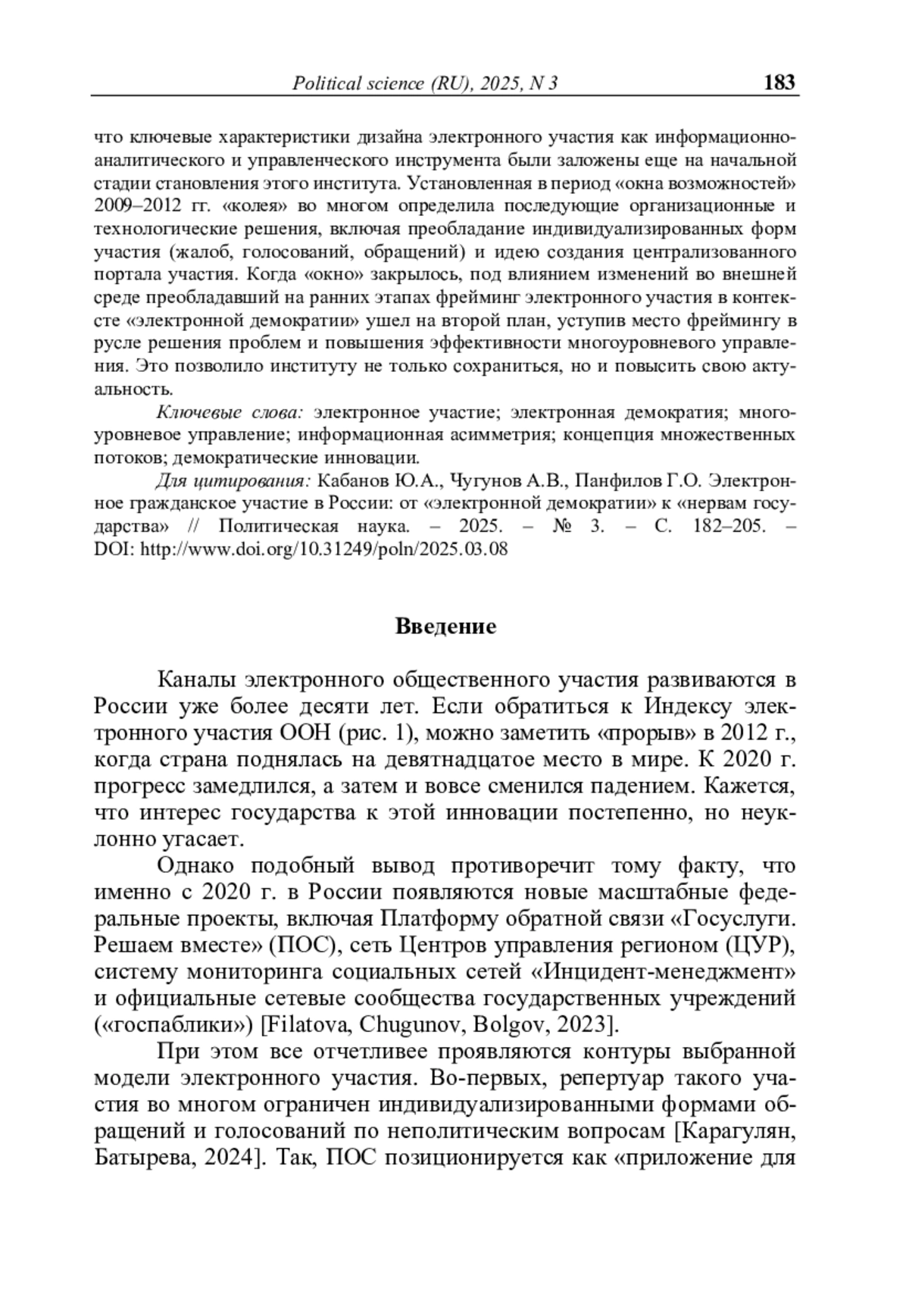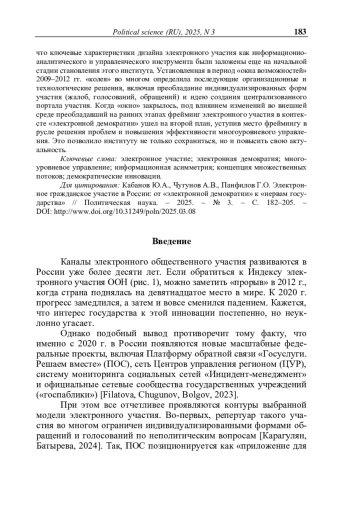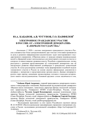 11. Чугунов А.В., Панфилов Г.О., Кабанов Ю.А. Централизация системы электронного участия в России: Взгляд из регионов // Вестник Пермского университета. Серия: Политология. - 2024. - Т. 18, № 2. - С. 25-35. - https://doi.org/10.17072/2218-1067-2024-2-25-35