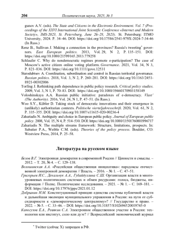 9. Панфилов Г.О., Волкова О.И., Чугунов А.В. Мониторинг каналов электронного участия в Российской Федерации: результаты исследований 2020-2023 гг. // Государство и граждане в электронной среде. Выпуск 7 (Труды XXVI Международной объединенной научной конференции «Интернет и современное общество», IMS-2023, Санкт-Петербург, 26-28июня 2023 г. Сборник научных статей) / под ред. И.И. Толстиковой, А.Ю. Федосовой, А.В. Чугунова. - СПб.: Университет ИТМО, 2024. - С. 34-46. - https://doi.org/10.22394/1726-1139-2024-5-253-264