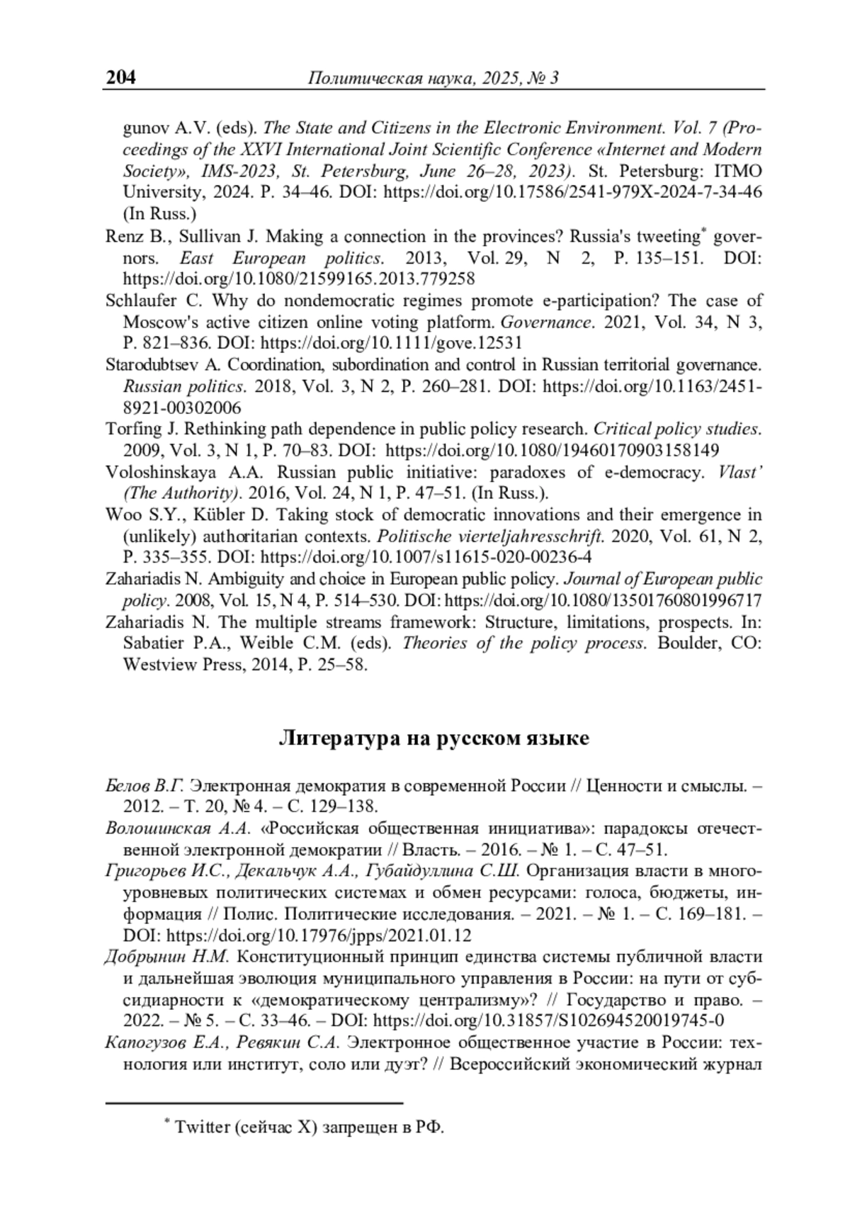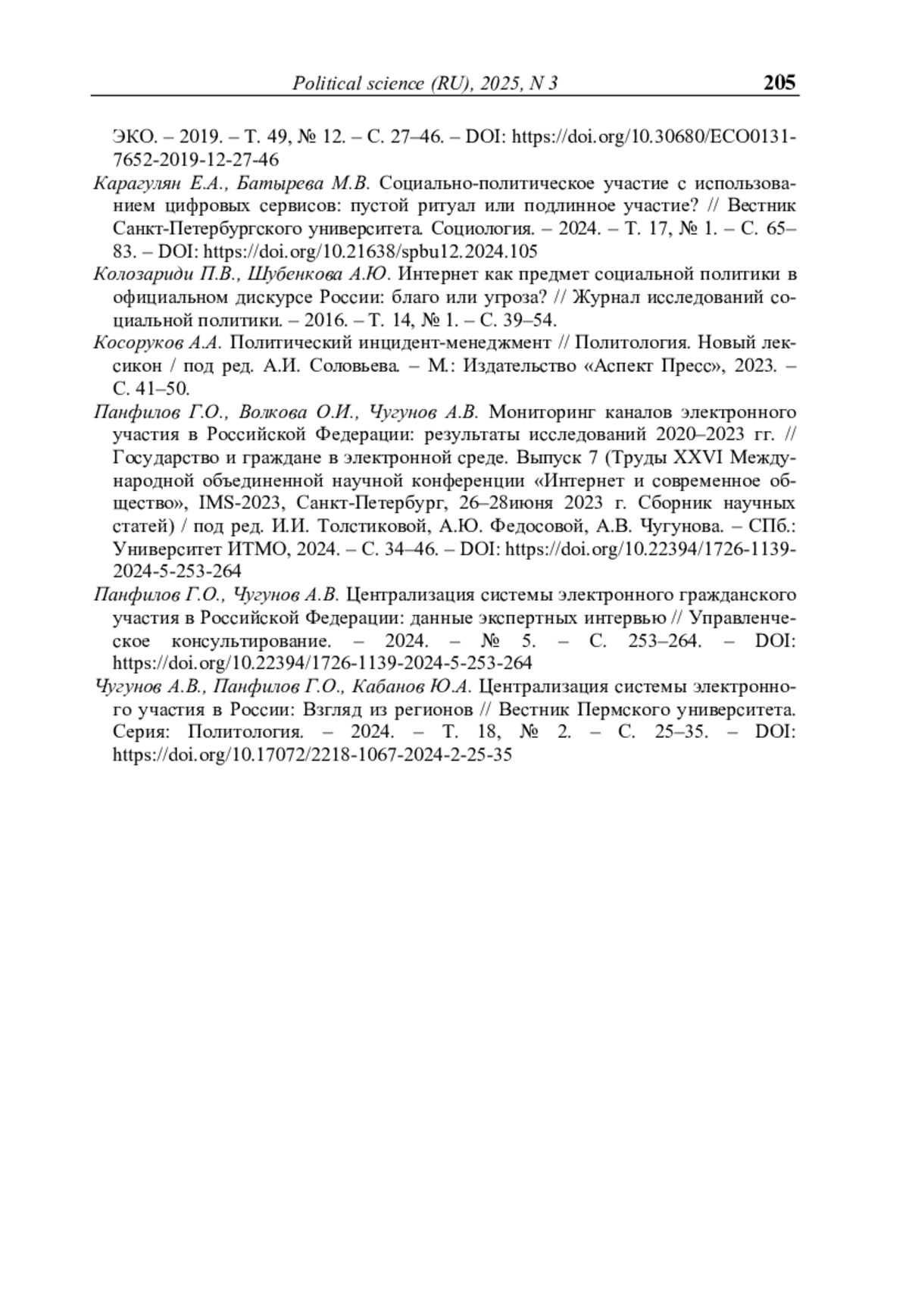6. Карагулян Е.А., Батырева М.В. Социально-политическое участие с использованием цифровых сервисов: пустой ритуал или подлинное участие? // Вестник Санкт-Петербургского университета. Социология. - 2024. - Т. 17, № 1. - С. 65- 83. - https://doi.org/10.21638/spbu12.2024.105