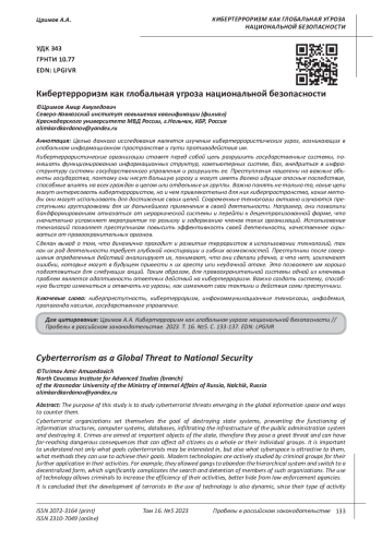 Kochesokov R.H. Features of cyberterrorism and ways to combat it from the world community // Journal of Applied Research. 2023. No. 4. pp. 134-137.