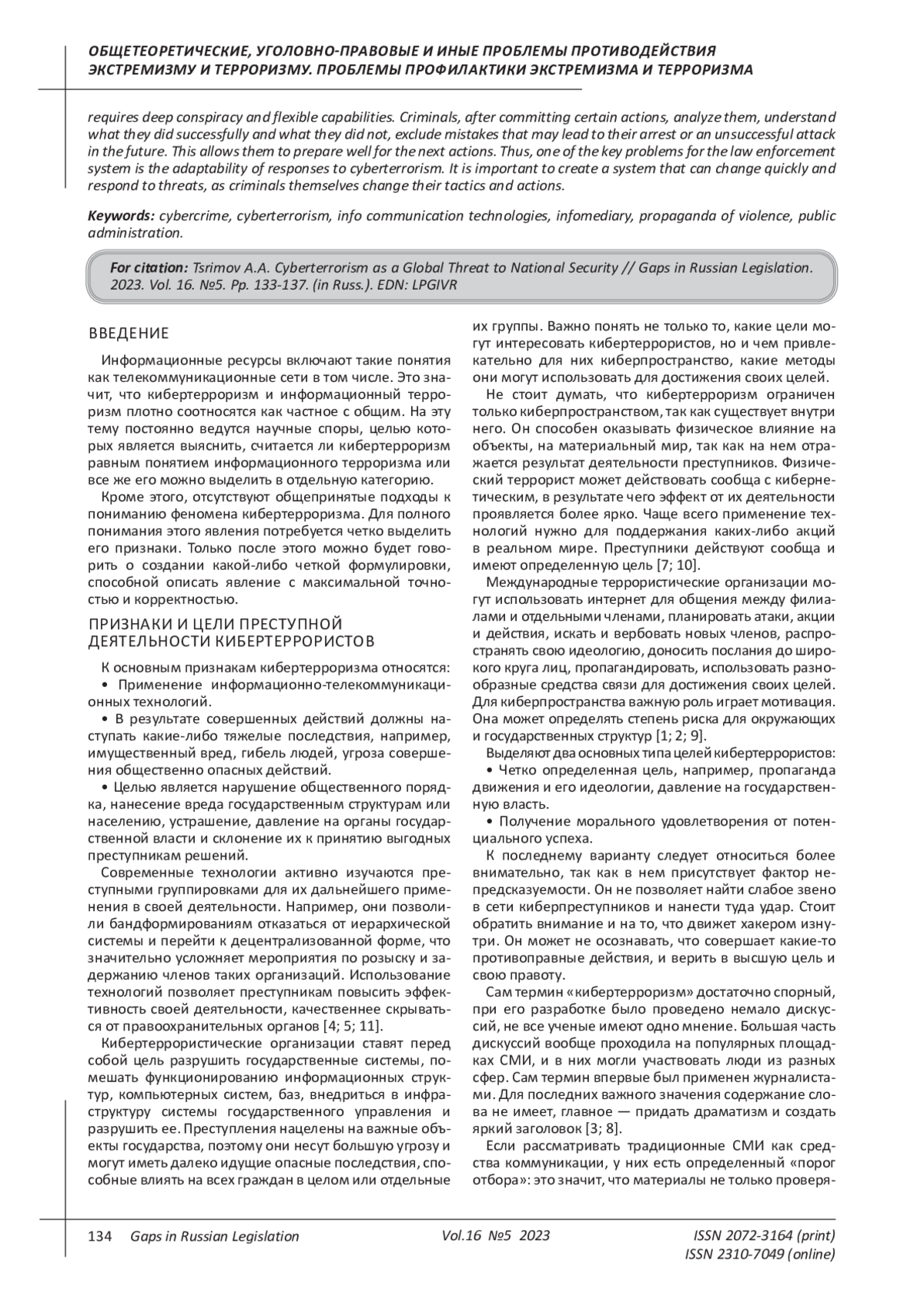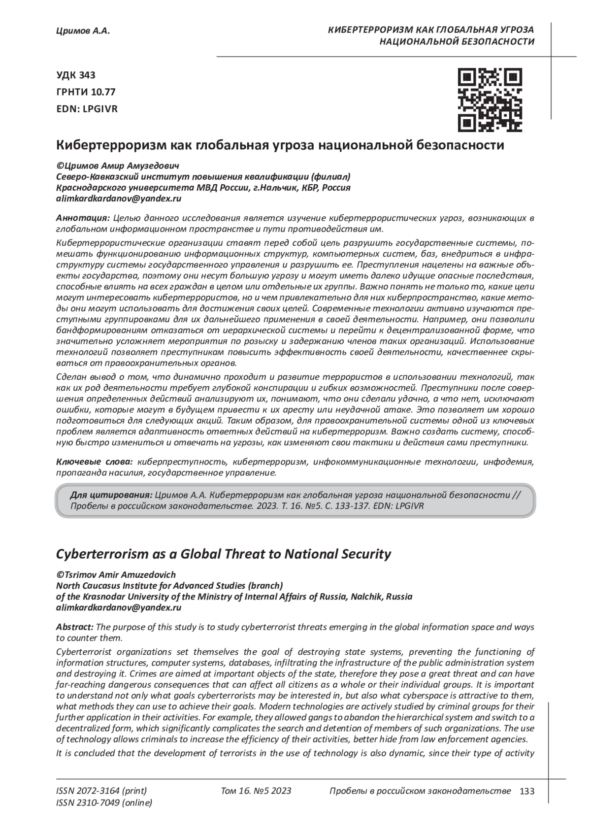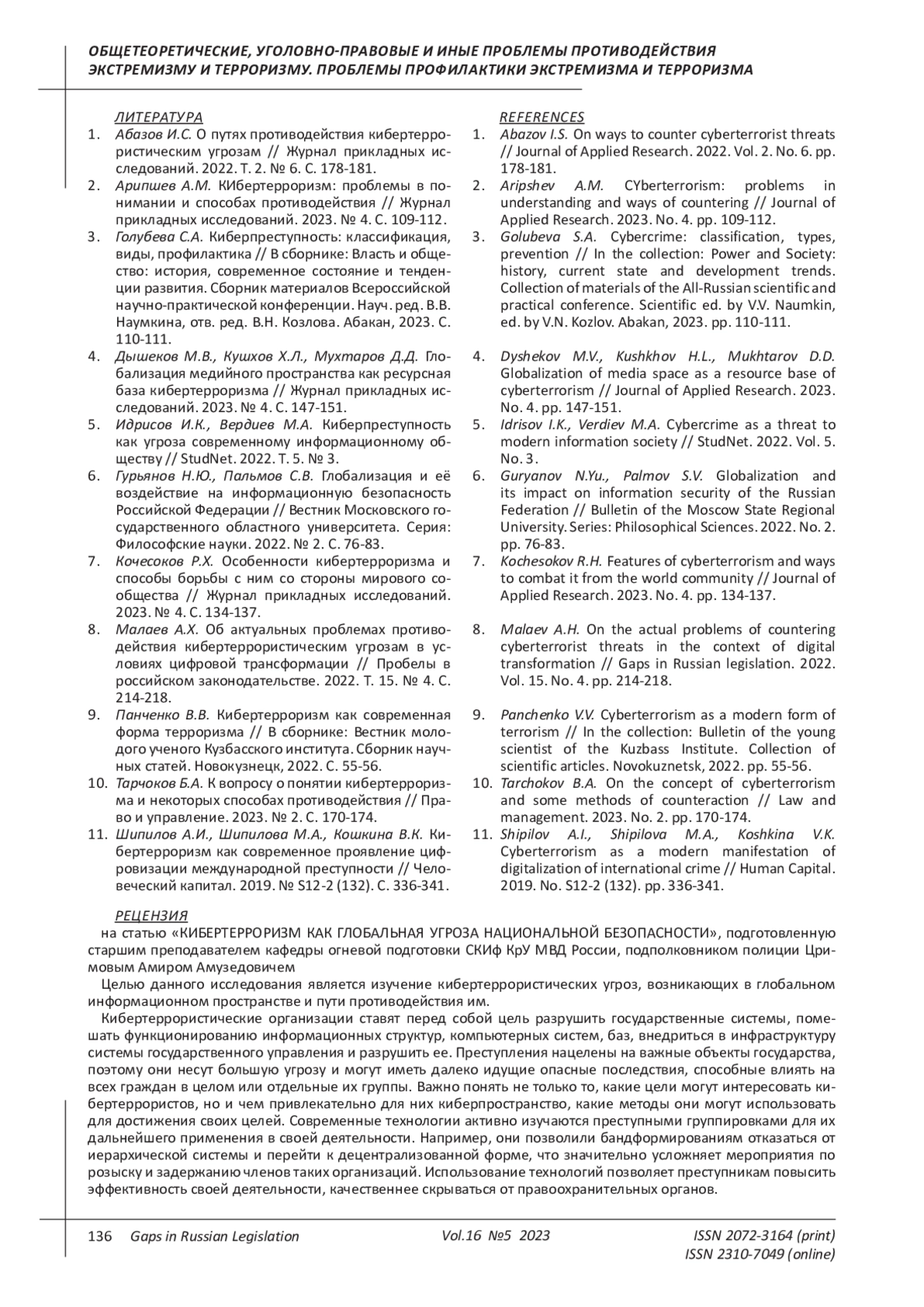2. Арипшев А.М. Кибертерроризм: проблемы в понимании и способах противодействия // Журнал прикладных исследований. 2023. № 4. С. 109-112. EDN: VLHRGV