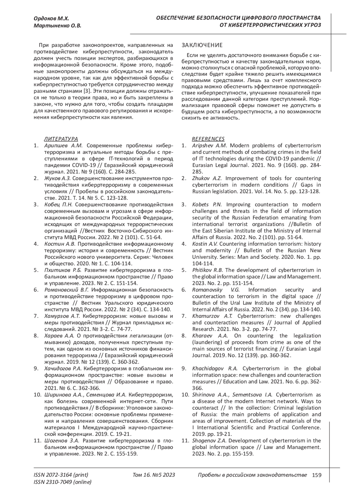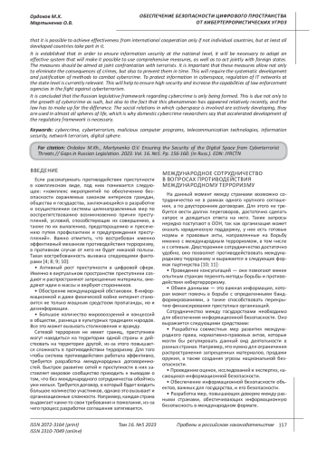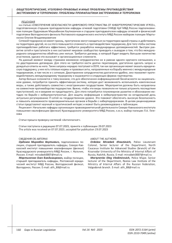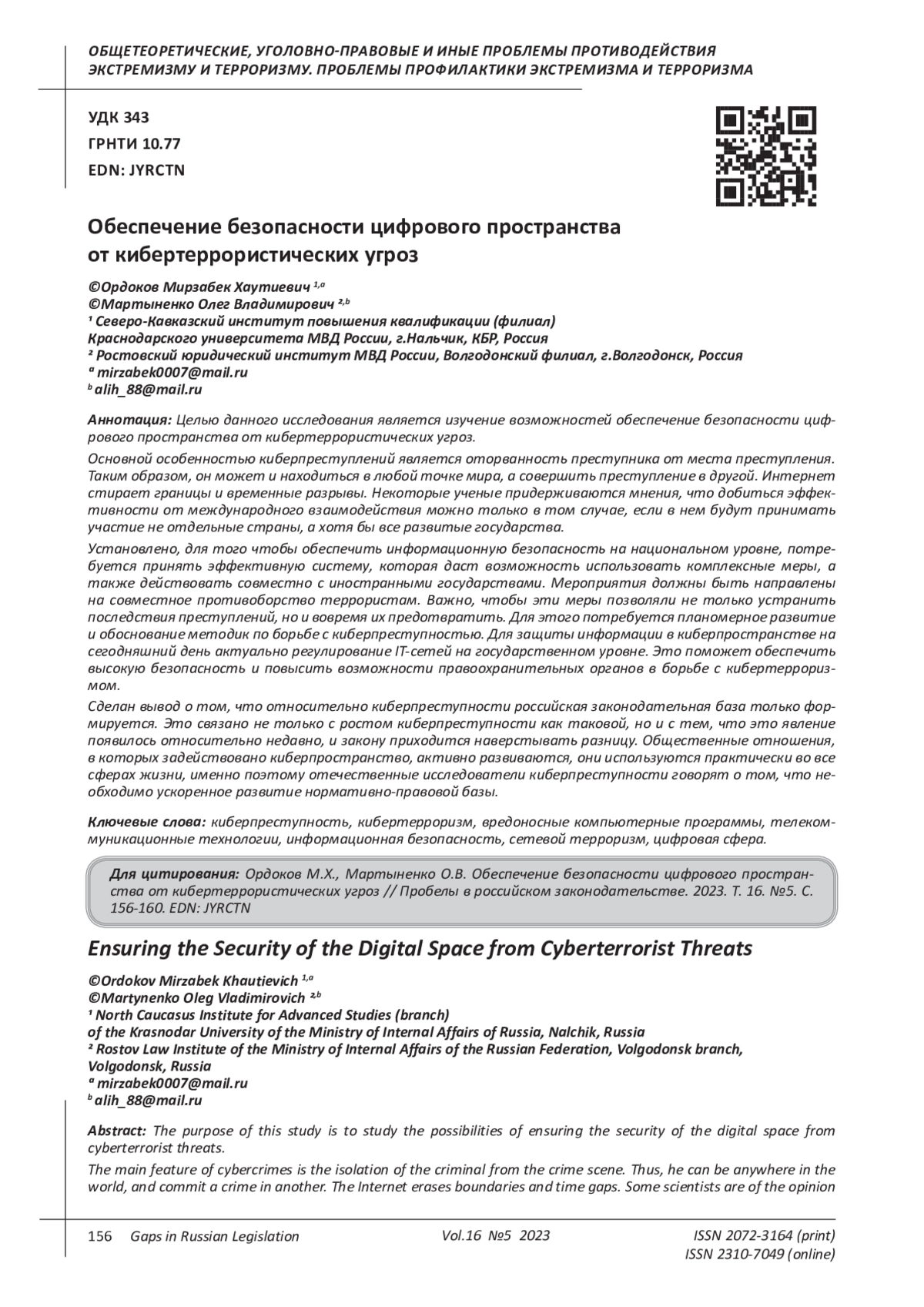 ОРДОКОВ М. Х., МАРТЫНЕНКО О. В. ОБЕСПЕЧЕНИЕ БЕЗОПАСНОСТИ ЦИФРОВОГО ПРОСТРАНСТВА ОТ КИБЕРТЕРРОРИСТИЧЕСКИХ УГРОЗ // ПРОБЕЛЫ В РОССИЙСКОМ ЗАКОНОДАТЕЛЬСТВЕ. 2023. Т. 16 № 5