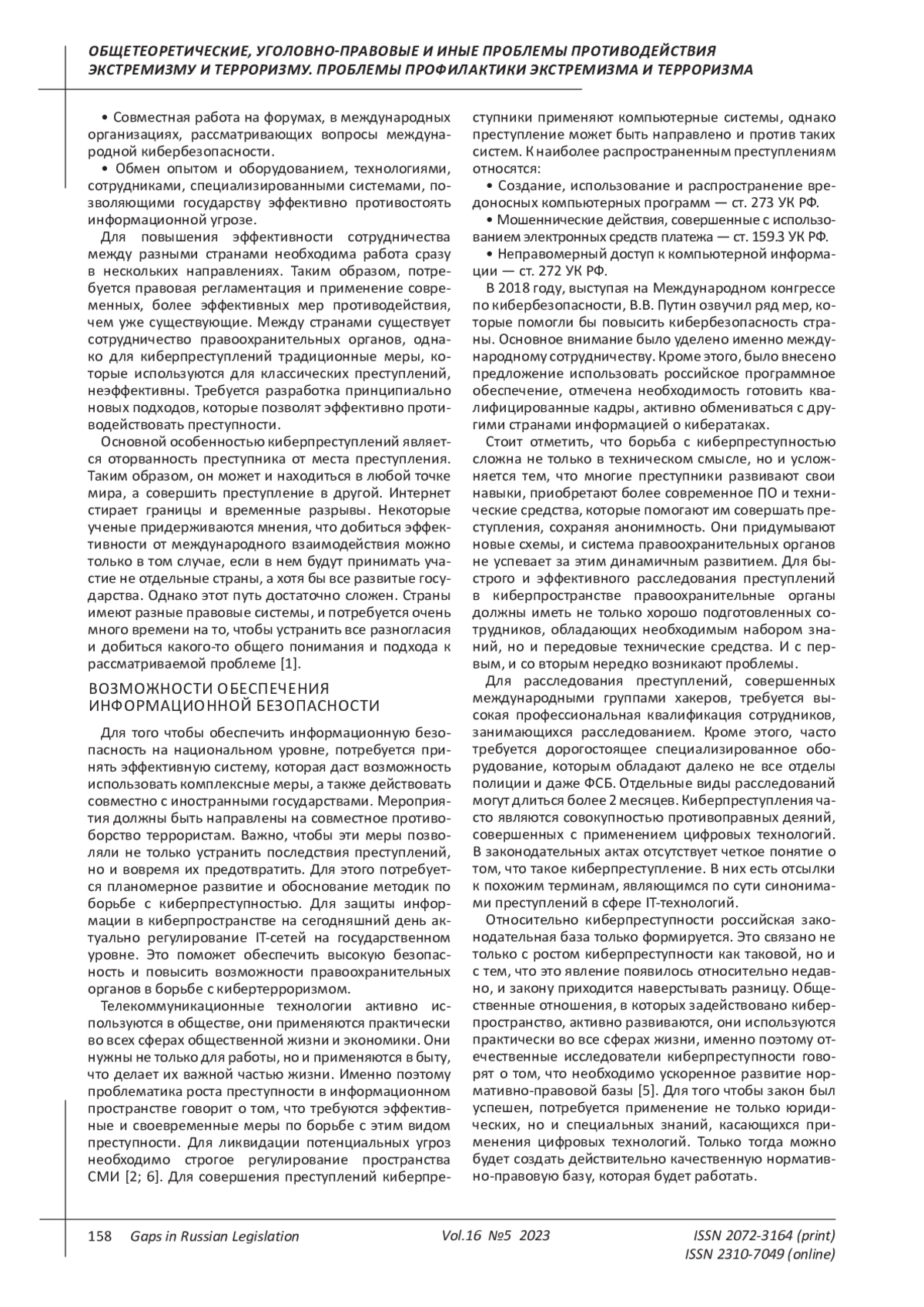 Статья: ОБЕСПЕЧЕНИЕ БЕЗОПАСНОСТИ ЦИФРОВОГО ПРОСТРАНСТВА ОТ КИБЕРТЕРРОРИСТИЧЕСКИХ УГРОЗ (2023)