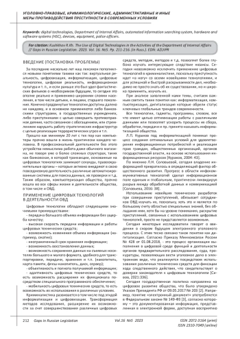Целью данной статьи является освещение основных направлений использования цифровых технологий в деятельности ОВД. Актуальность выбранной нами темы для изучения обусловлена тем, что цифровые технологии прочно вошли в жизнь каждого сотрудника правоохранительных органов. Цифровые средства криминалистической техники представляют собой аппаратно-программные комплексы, технические средства (аппараты, устройства, приборы, оборудование), компоненты робототехники, специализированное программное обеспечение, используемые в целях исследования, обнаружения, изъятия, фиксации и проверки информации. Выводы: В статье нами было подробно описано каким образом цифровые технологии применяются в деятельности ОВД, а также проанализированы точки зрения различных авторов относительно понятия цифровых технологий. Было выяснено и доказано, что цифровые технологии - это частный случай информационных технологий. На вооружении ОВД сегодня находится самая разнообразная специальная цифровая техника, автоматические информационные поисковые системы. К сожалению, ввиду быстрого научно-технического прогресса, данные сервисы быстро устаревают, в то время как преступный мир обладает самыми современными новинками, с которыми имеющаяся техника не идет ни в какое сравнение. Существует насущная необходимость обучения сотрудников, которые могли бы ориентироваться как современной технике и технологиях, так и в способах, посредством которых можно расследовать цифровые преступления, ориентироваться в имеющихся сервисах и уметь применять их на практике.